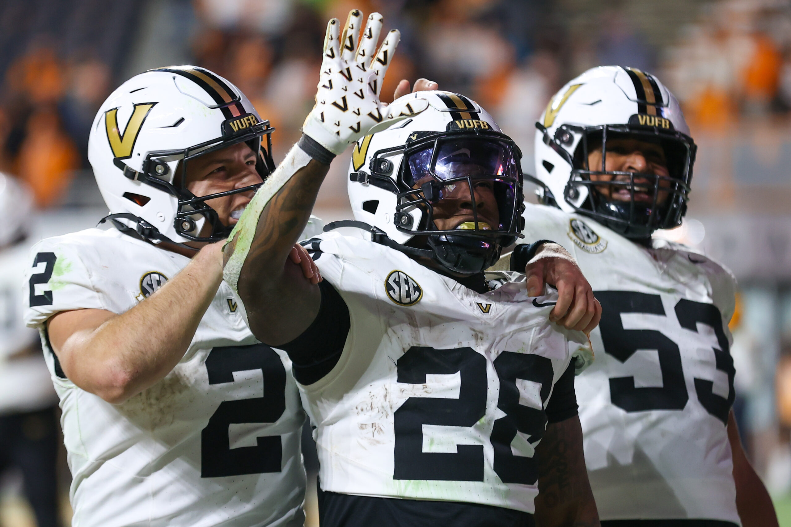 Nov 29, 2025; Knoxville, Tennessee, USA; Vanderbilt Commodores quarterback Diego Pavia (2), running back Sedrick Alexander (28) and offensive lineman Jordan White (53) celebrate a touchdown against the Tennessee Volunteers during the second half at Neyland Stadium. Mandatory Credit: Randy Sartin-Imagn Images