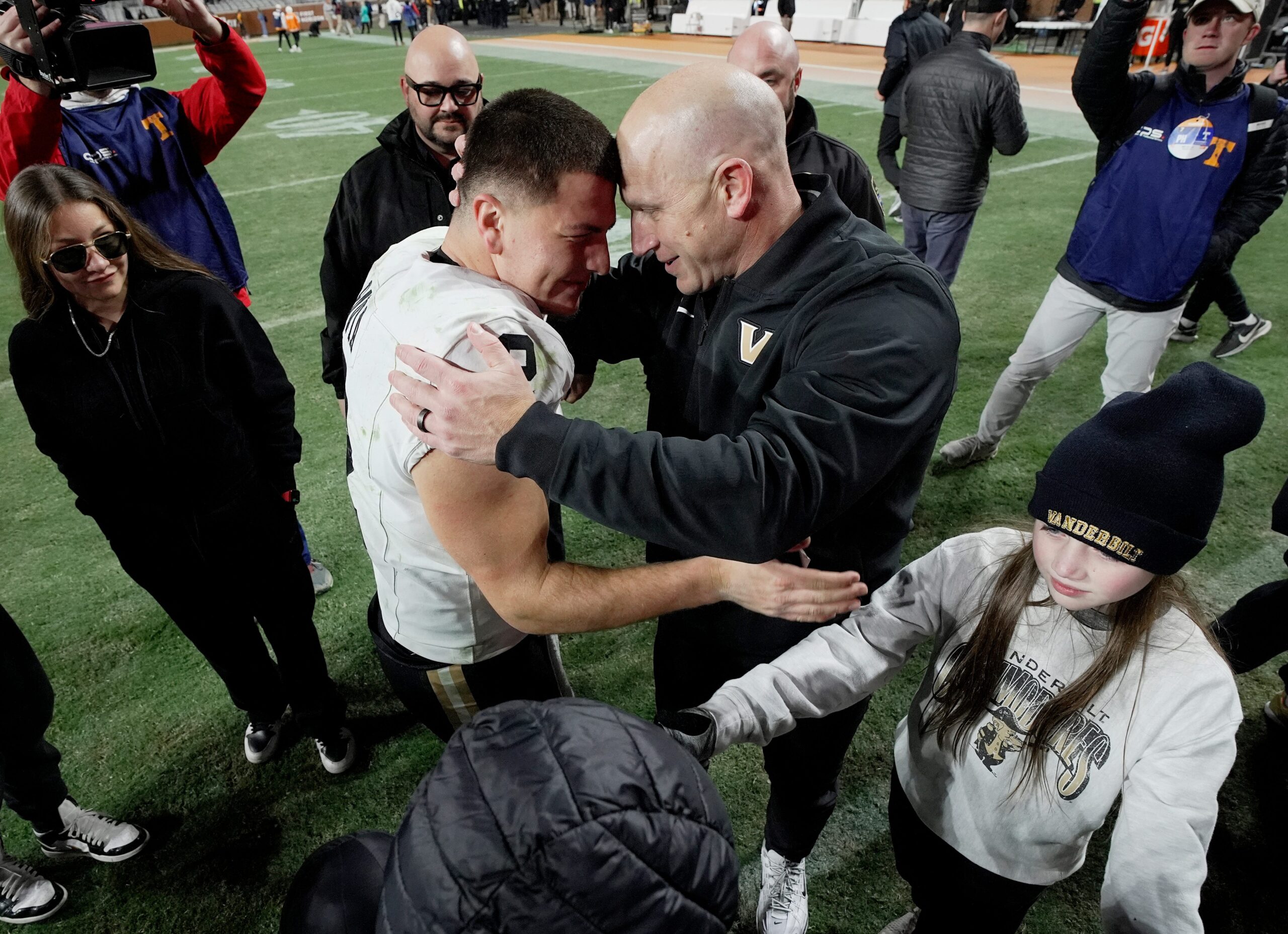 Vanderbilt quarterback Diego Pavia (2) and coach Clark Lea embrace after the team’s win against Tennessee at Neyland Stadium in Knoxville, Tenn., Saturday, Nov. 29, 2025.