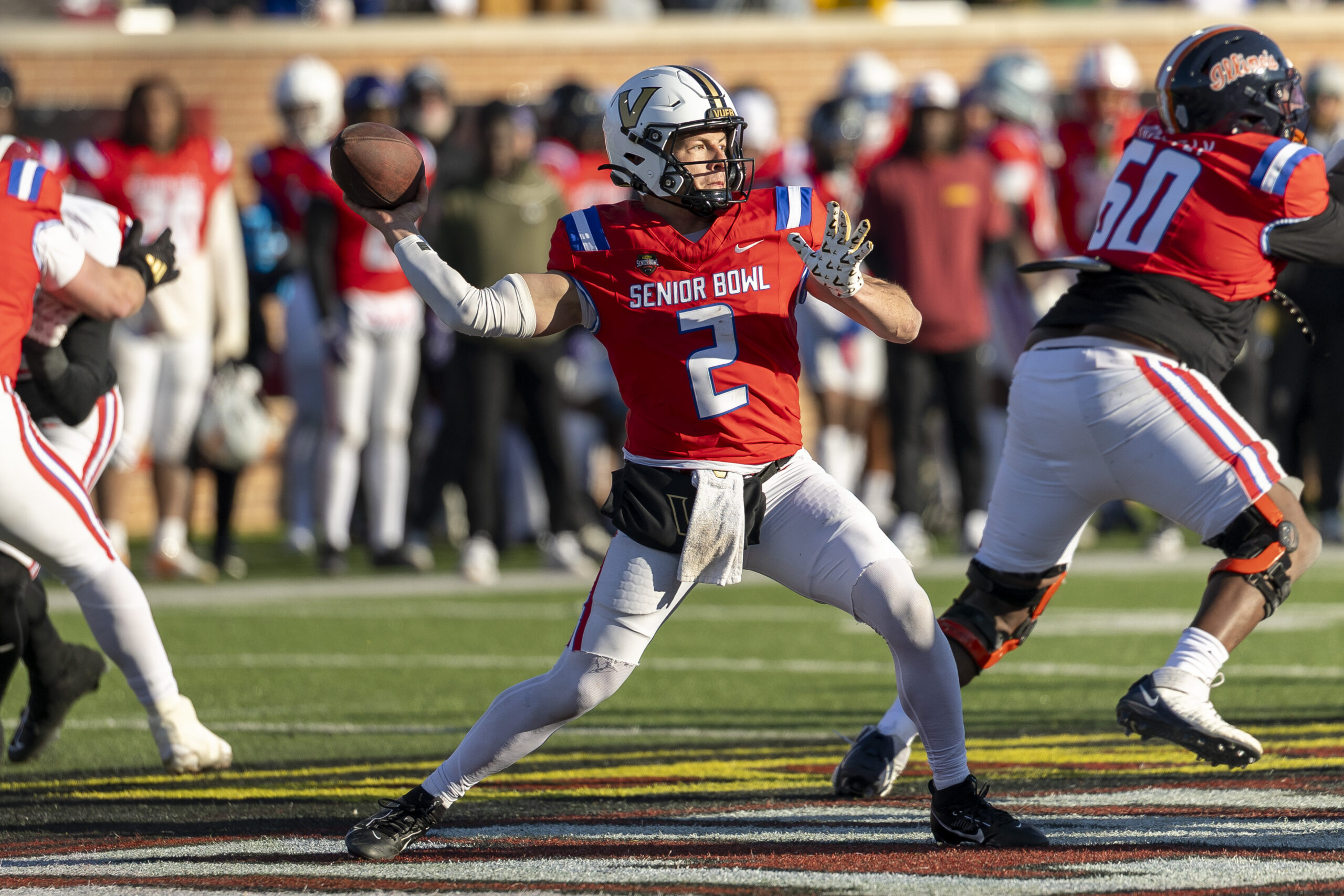 Jan 31, 2026; Mobile, AL, USA; National quarterback Diego Pavia (2) of Vanderbilt throws the ball during the second half of the 2026 Senior Bowl at University of South Alabama, Hancock Whitney Stadium. Mandatory Credit: Vasha Hunt-Imagn Images