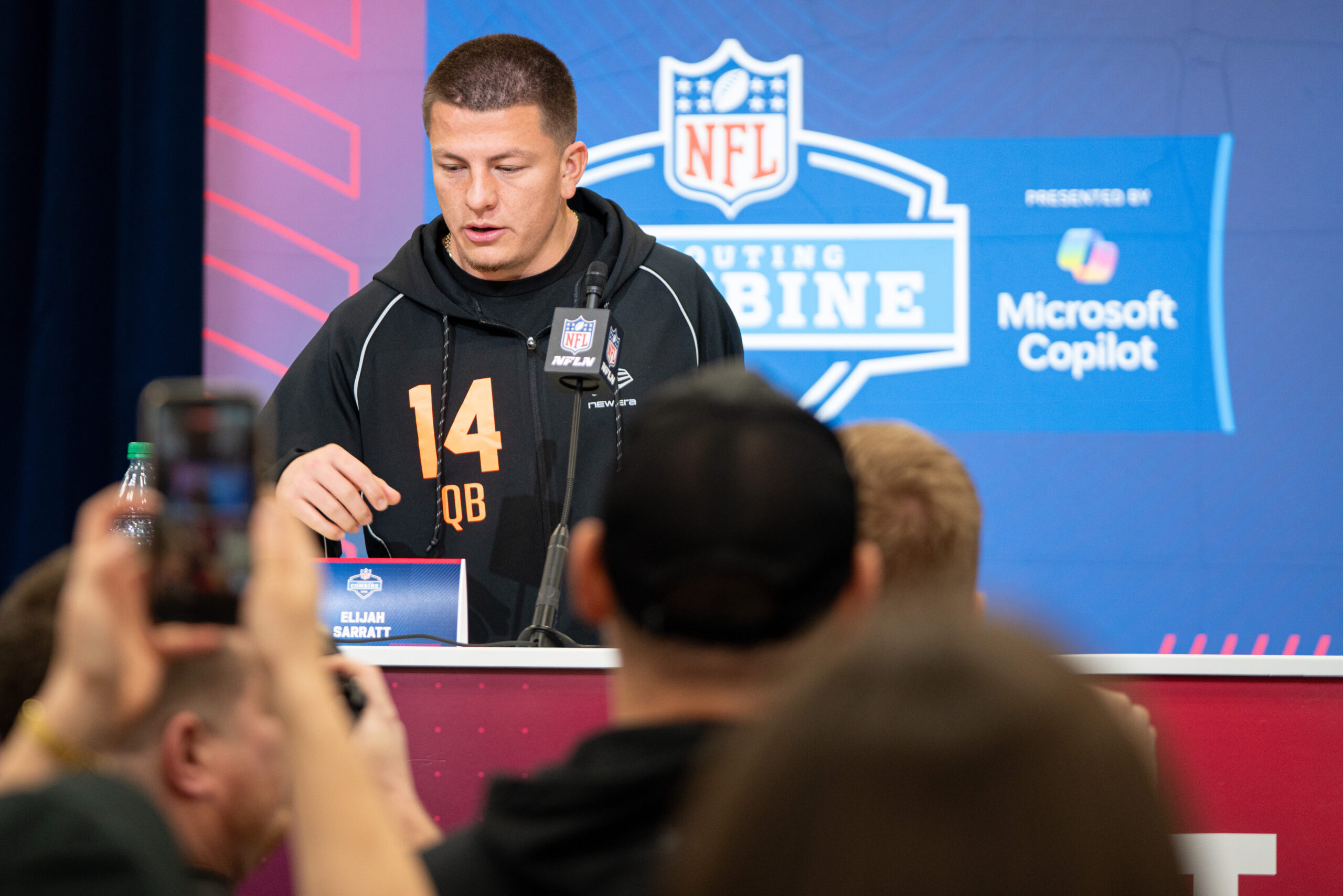 Feb 27, 2026; Indianapolis, IN, USA; Vanderbilt quarterback Diego Pavia (QB14) walks to the wrong podium before speaking to members of the media during the NFL Combine at the Indiana Convention Center. Mandatory Credit: Jacob Musselman-Imagn Images