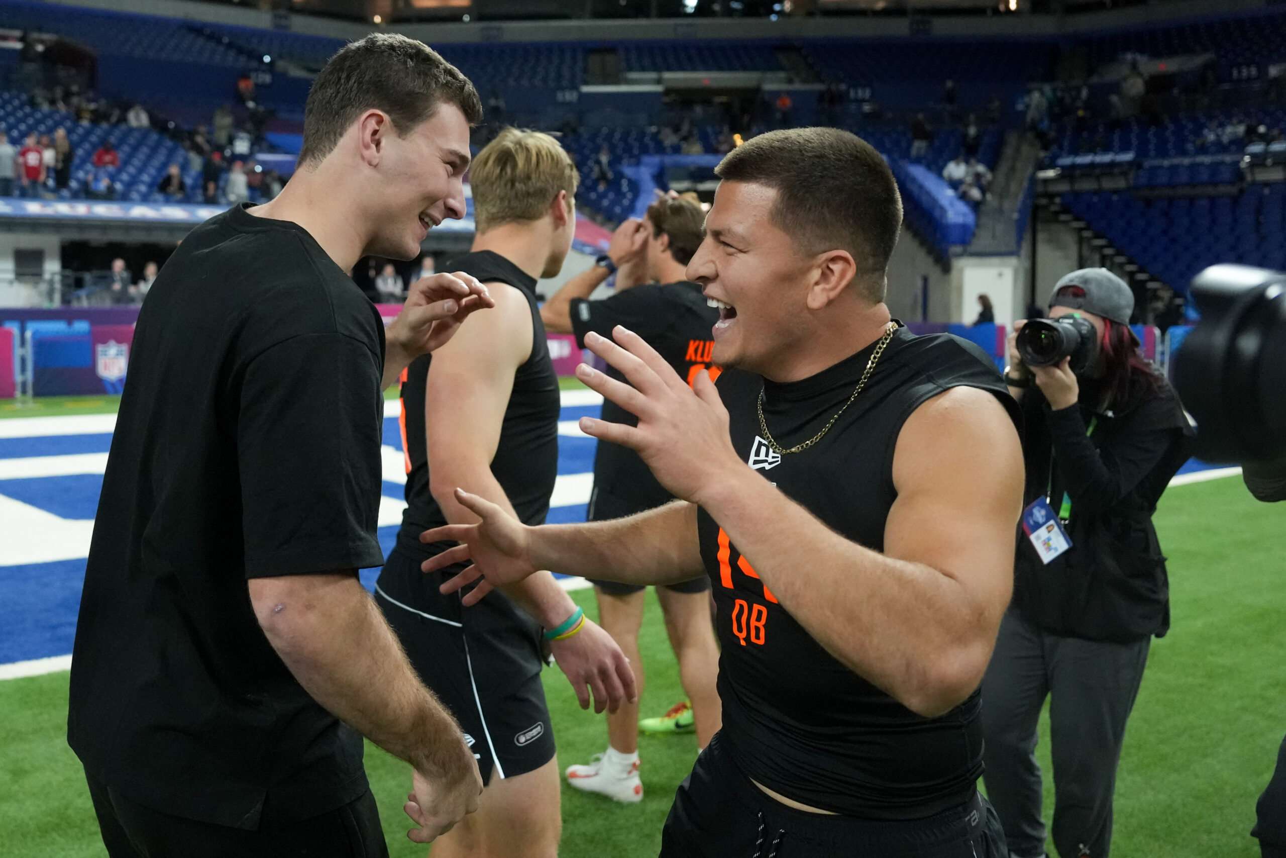 Feb 28, 2026; Indianapolis, IN, USA; Indiana quarterback Fernando Mendoza (QB11) greets Vanderbilt quarterback Diego Pavia (QB14) during the NFL Scouting Combine at Lucas Oil Stadium. Mandatory Credit: Kirby Lee-Imagn Images