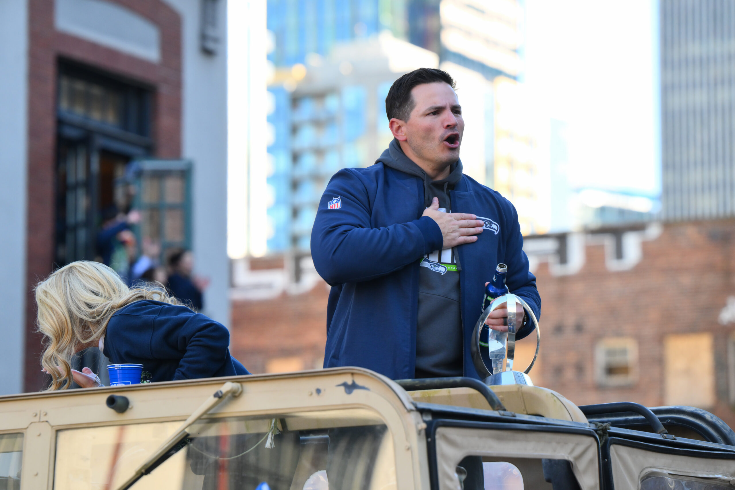 Feb 11, 2026; Seattle, WA, USA; Seattle Seahawks head coach Mike MacDonald interacts with fans during the Super Bowl LX World Champions parade in downtown Seattle. Mandatory Credit: Steven Bisig-Imagn Images