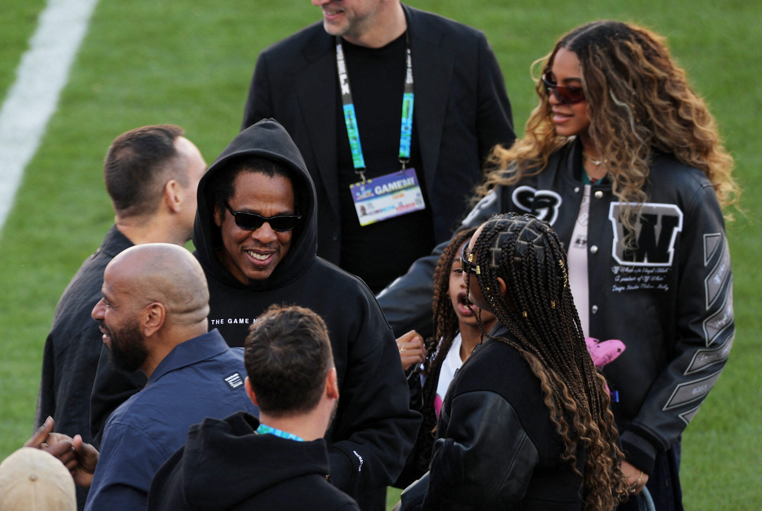 [US, Mexico & Canada customers only] Feb 8, 2026; Santa Clara, CA, USA; Recording artist Jay-Z and his daughter Blue Ivy before Super Bowl LX between the New England Patriots and the Seattle Seahawks at Levi’s Stadium. Mandatory Credit: Carlos Barria/Reuters via Imagn Images