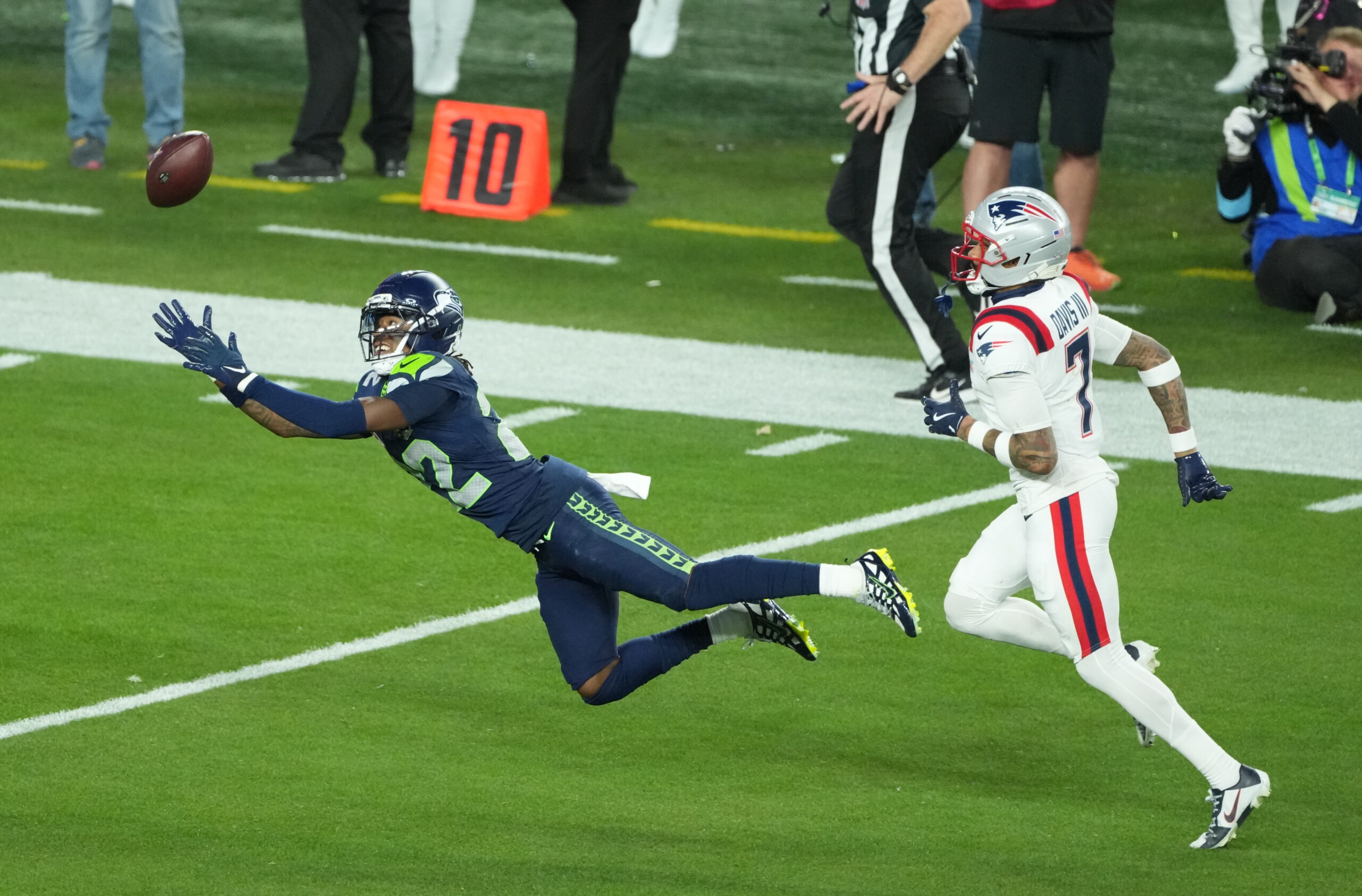 Feb 8, 2026; Santa Clara, CA, USA; Seattle Seahawks wide receiver Rashid Shaheed (22) cannot catch a pass while defended by New England Patriots cornerback Carlton Davis III (7) in the second half in Super Bowl LX at Levi’s Stadium. Mandatory Credit: Kirby Lee-Imagn Images