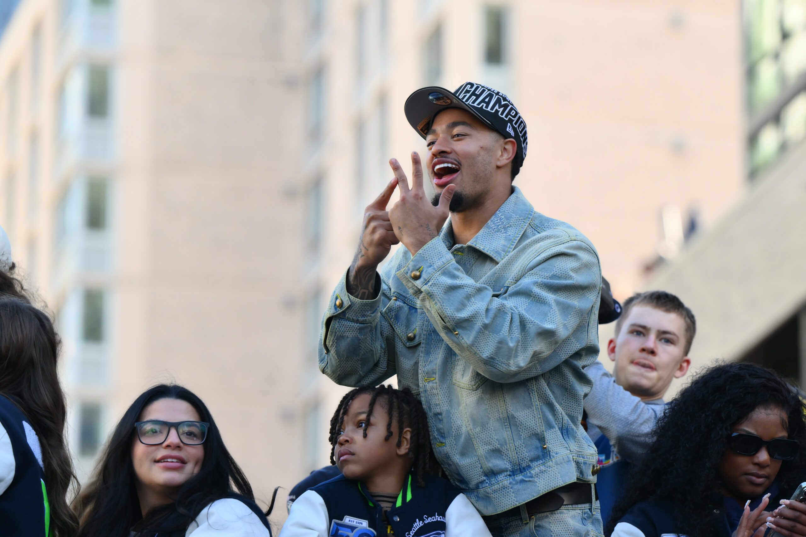 Feb 11, 2026; Seattle, WA, USA; Seattle Seahawks wide receiver Jaxon Smith-Njigba (11) interacts with fans during the Super Bowl LX World Champions parade in downtown Seattle. Mandatory Credit: Steven Bisig-Imagn Images