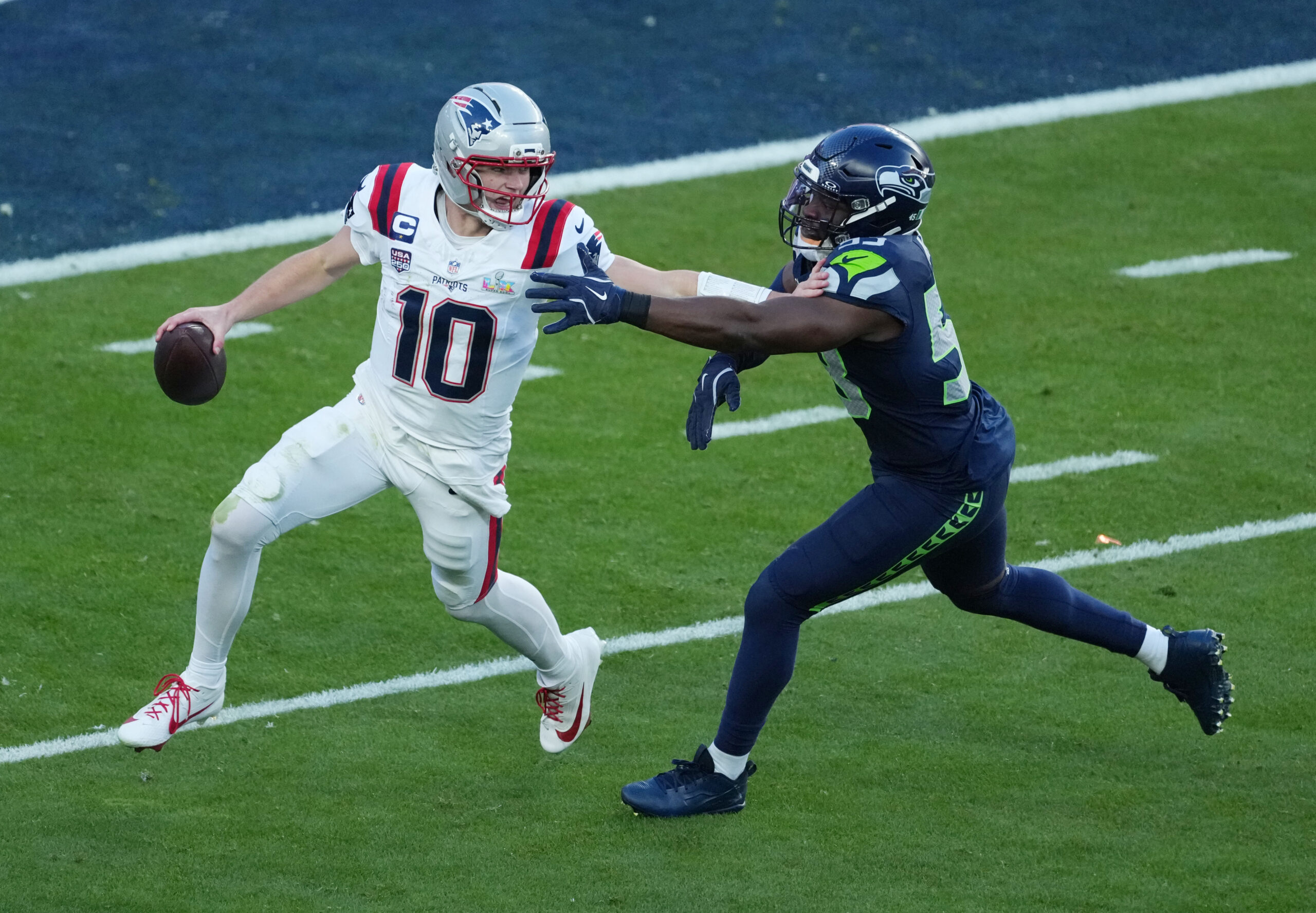 Feb 8, 2026; Santa Clara, CA, USA; New England Patriots quarterback Drake Maye (10) is pressured by Seattle Seahawks linebacker Boye Mafe (53) in the first half in Super Bowl LX at Levi’s Stadium. Mandatory Credit: Kirby Lee-Imagn Images