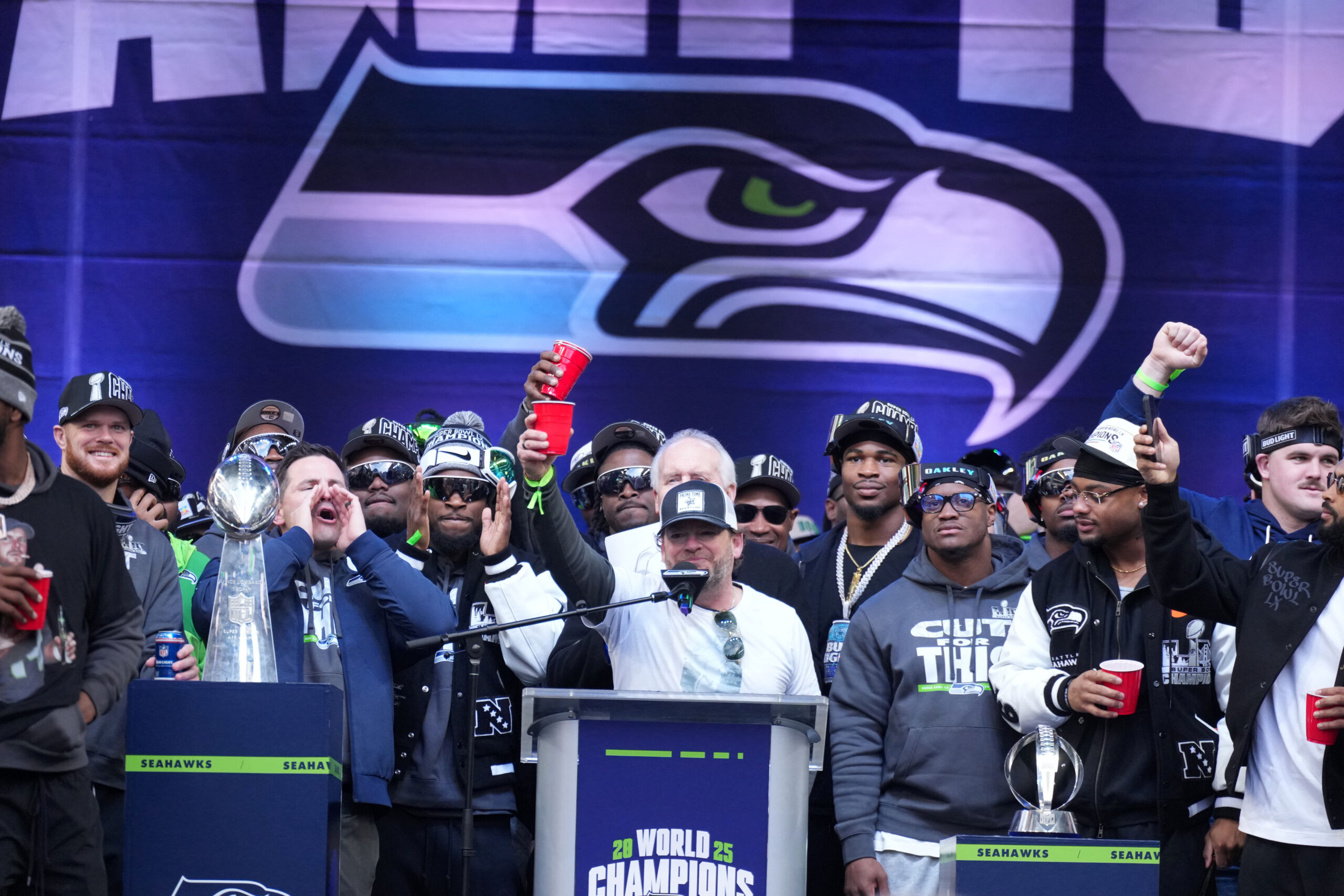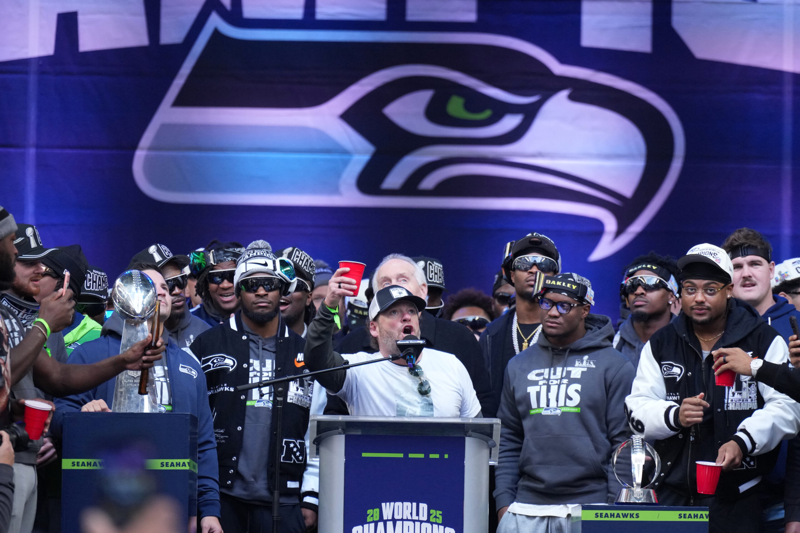 So picture this. It’s February 11, 2026. Up to a million fans have packed the streets of Seattle for the Seahawks’ Super Bowl LX championship parade — the city’s first title celebration in 12 years, and only the second in franchise history. Blue and green everywhere. Players rolling through on National Guard trucks and double-decker buses. A quick trophy ceremony at Lumen Field to kick the whole thing off. Pure, uncut euphoria! And then GM John Schneider grabbed the mic. And things got… weird.