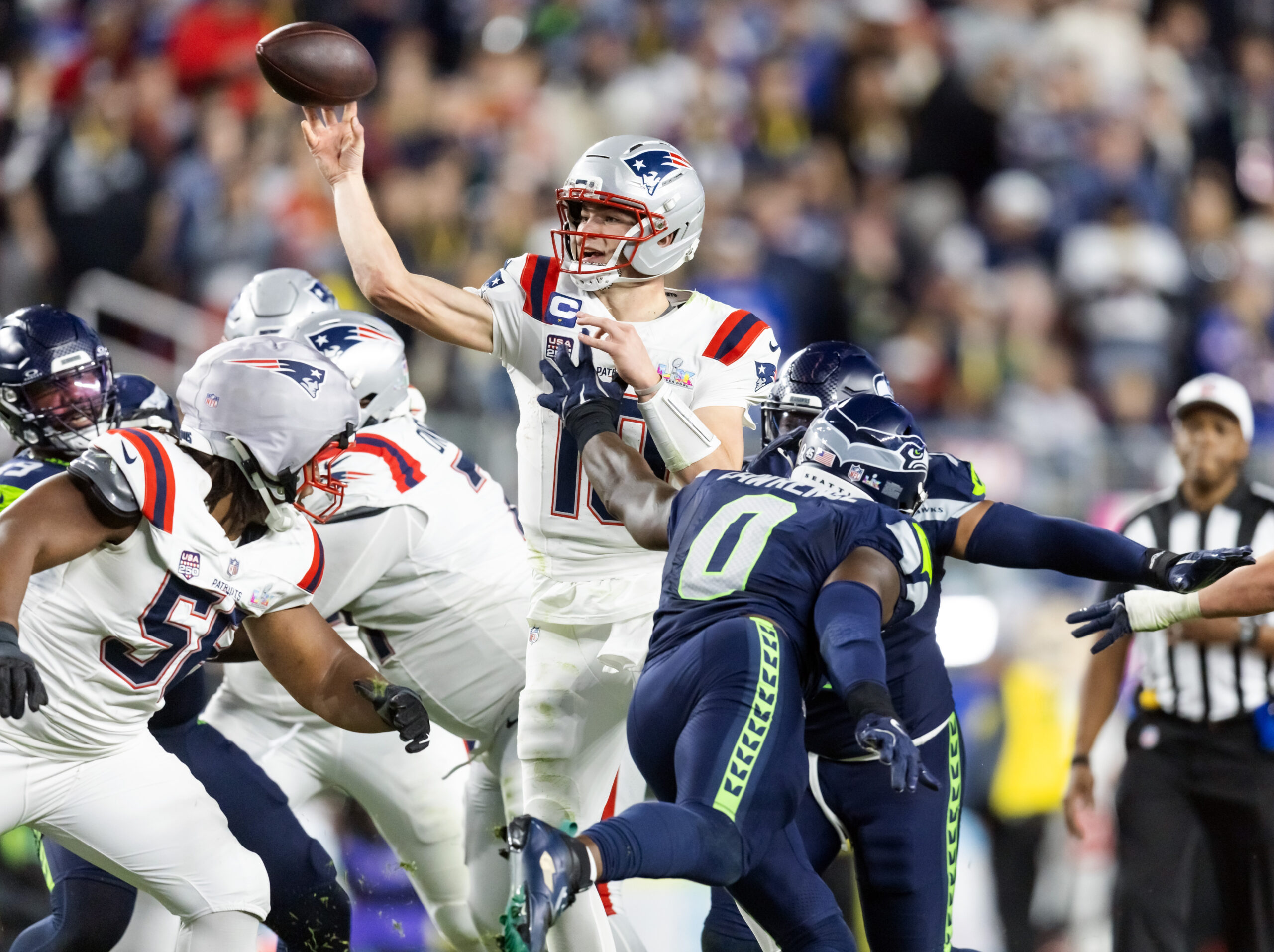 Feb 8, 2026; Santa Clara, CA, USA; New England Patriots quarterback Drake Maye (10) against the Seattle Seahawks during Super Bowl LX at Levi’s Stadium. Mandatory Credit: Mark J. Rebilas-Imagn Images