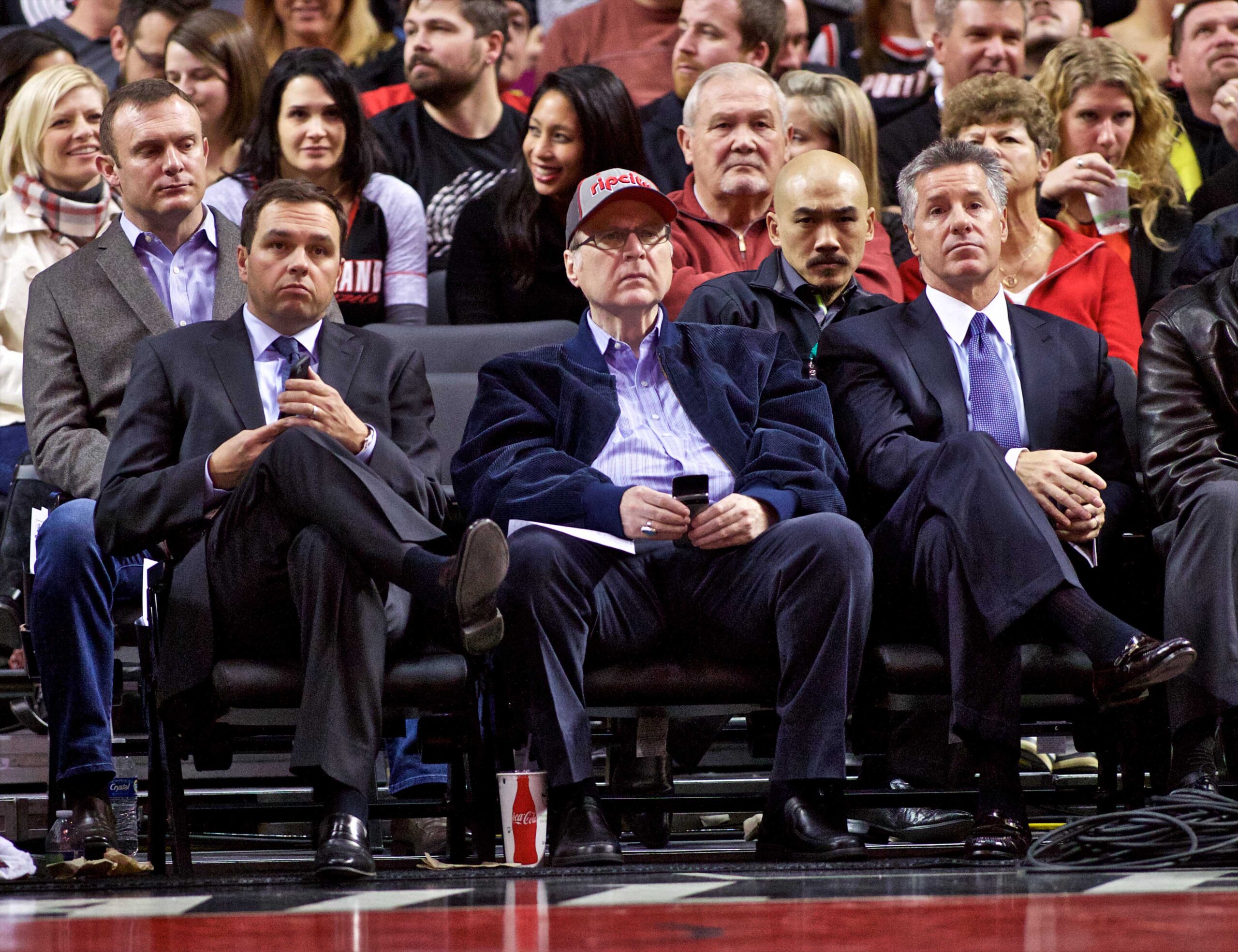 Jan 8, 2015; Portland, OR, USA; Portland Trail Blazers president Chris McGowan (left), owner Paul Allen (center) and general manager Neil Olshey (right) watch the game against the Miami Heat during the second quarter at the Moda Center. Mandatory Credit: Craig Mitchelldyer-Imagn Images