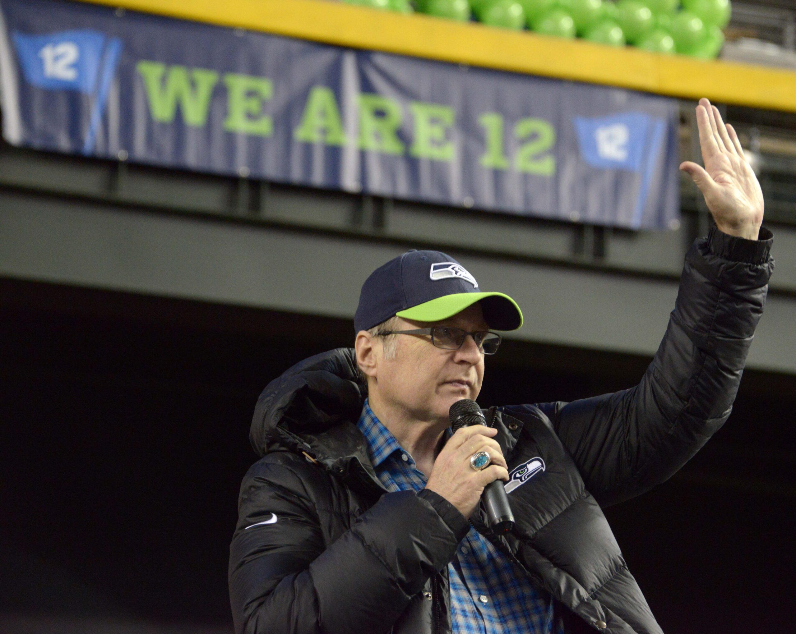 Jan 31, 2015; Phoenix, AZ, USA; Seattle Seahawks owner Paul Allen at the Seattle Seahawks 12Fest fan rally in the Desert at Chase Field prior to Super Bowl XLIX. Mandatory Credit: Kirby Lee-Imagn Images
