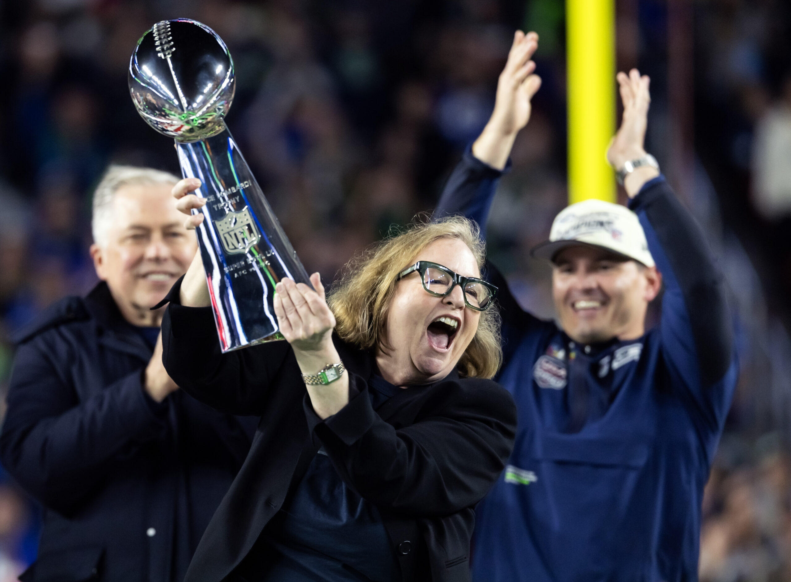Feb 8, 2026; Santa Clara, CA, USA; Seattle Seahawks chairman Jody Allen celebrates with the Vince Lombardi trophy on the podium after defeating the New England Patriots in Super Bowl LX at Levi’s Stadium. Mandatory Credit: Mark J. Rebilas-Imagn Images