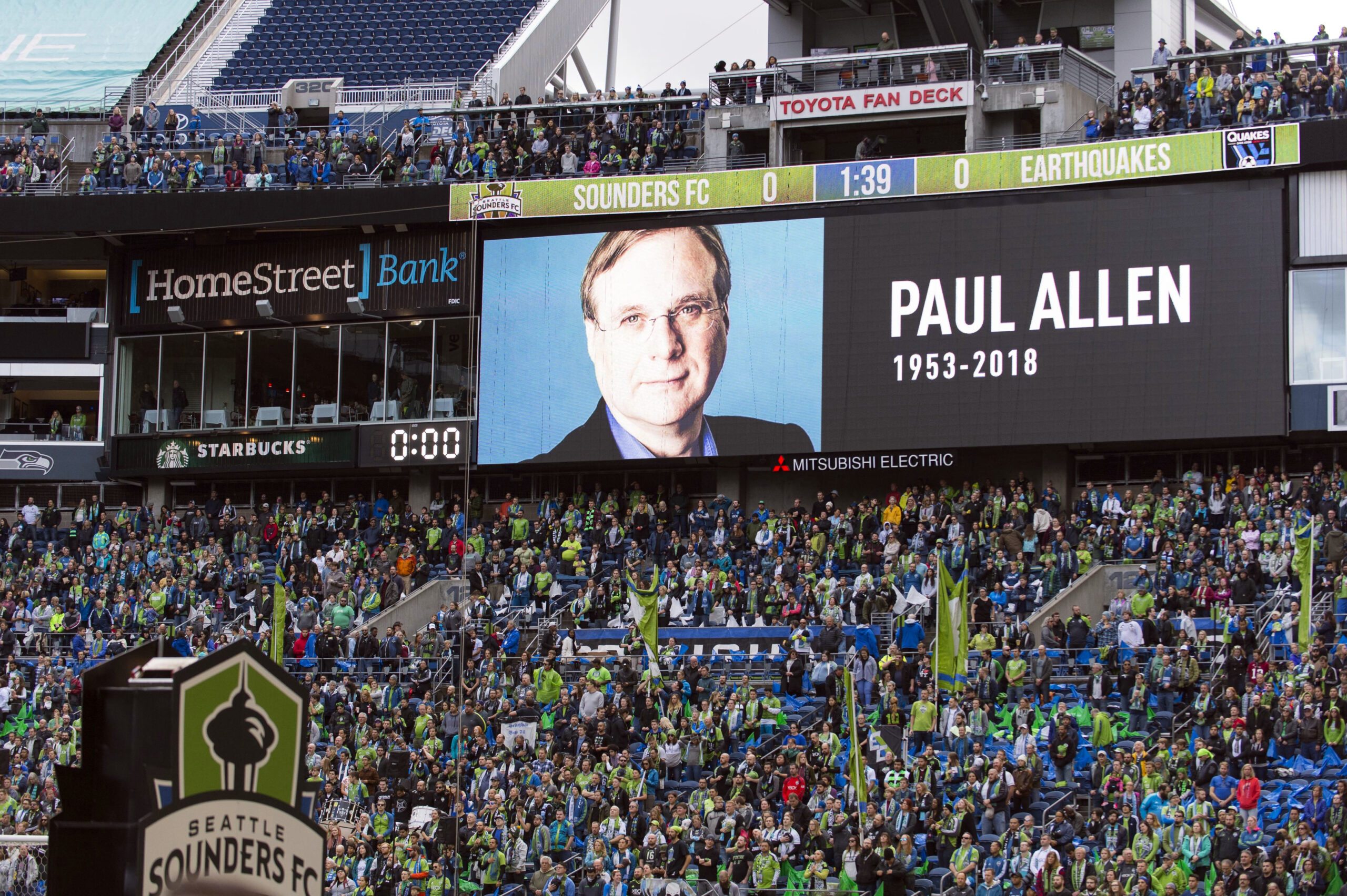 Oct 28, 2018; Seattle, WA, USA; The Seattle Sounders honor Paul Allen prior to the game between the Seattle Sounders and the San Jose Earthquakes at CenturyLink Field. Mandatory Credit: Steven Bisig-Imagn Images