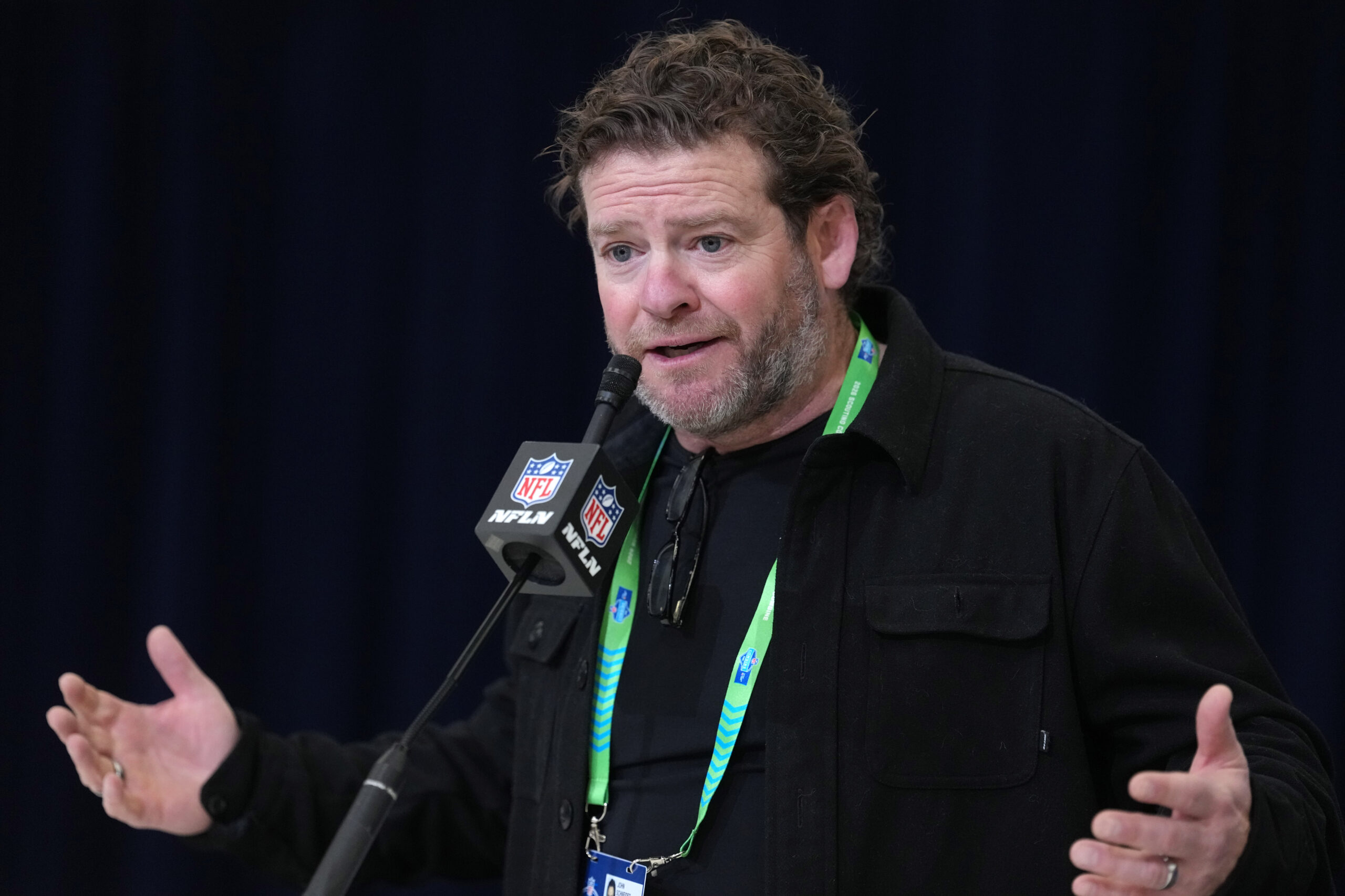 Feb 24, 2026; Indianapolis, IN, USA; Seattle Seahawks general manager John Schneider speaks at the NFL Scouting Combine at the Indiana Convention Center. Mandatory Credit: Kirby Lee-Imagn Images