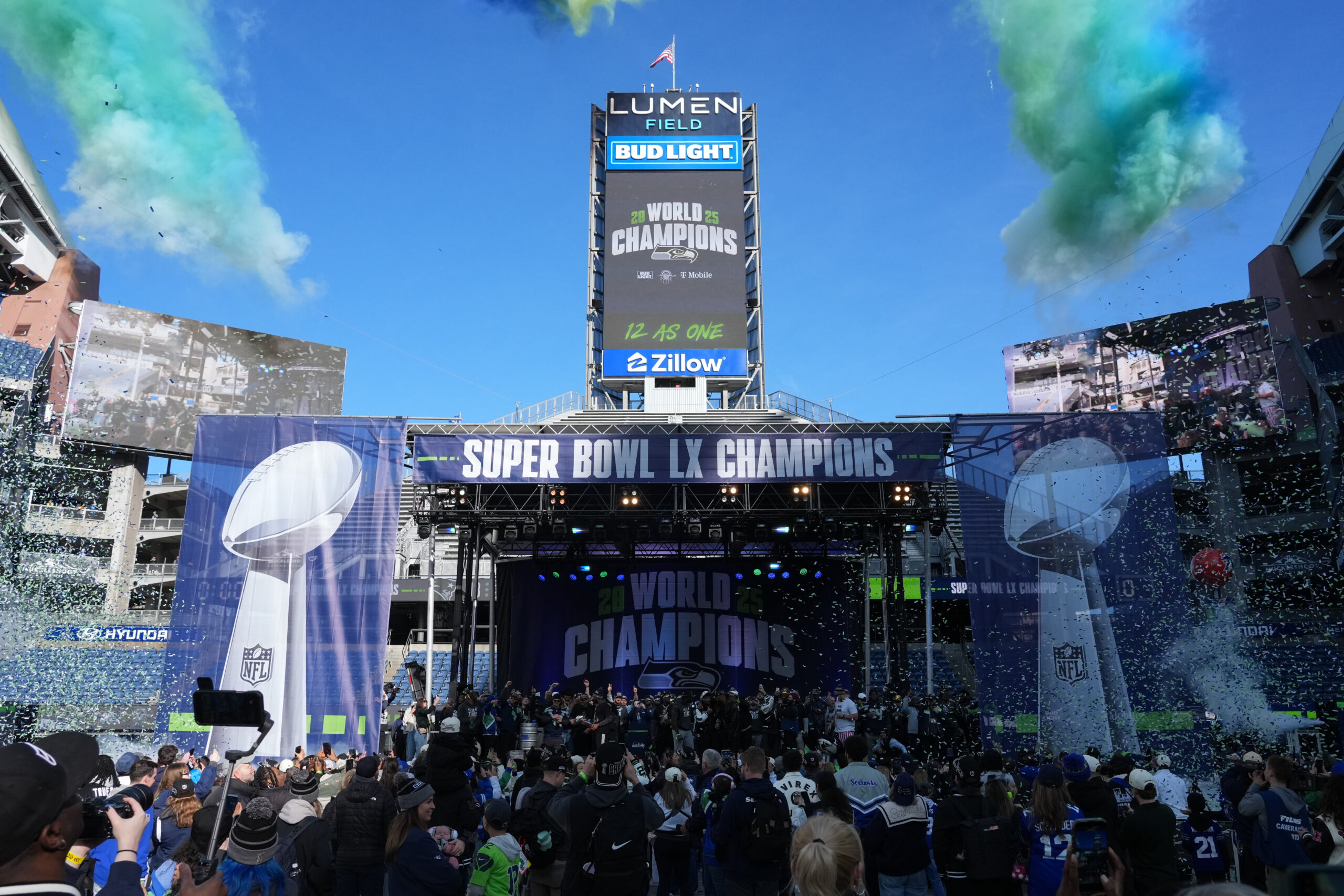Feb 11, 2026; Seattle, WA, USA; Confetti falls during the Super Bowl LX trophy celebration at Lumen Field. Mandatory Credit: Kirby Lee-Imagn Images