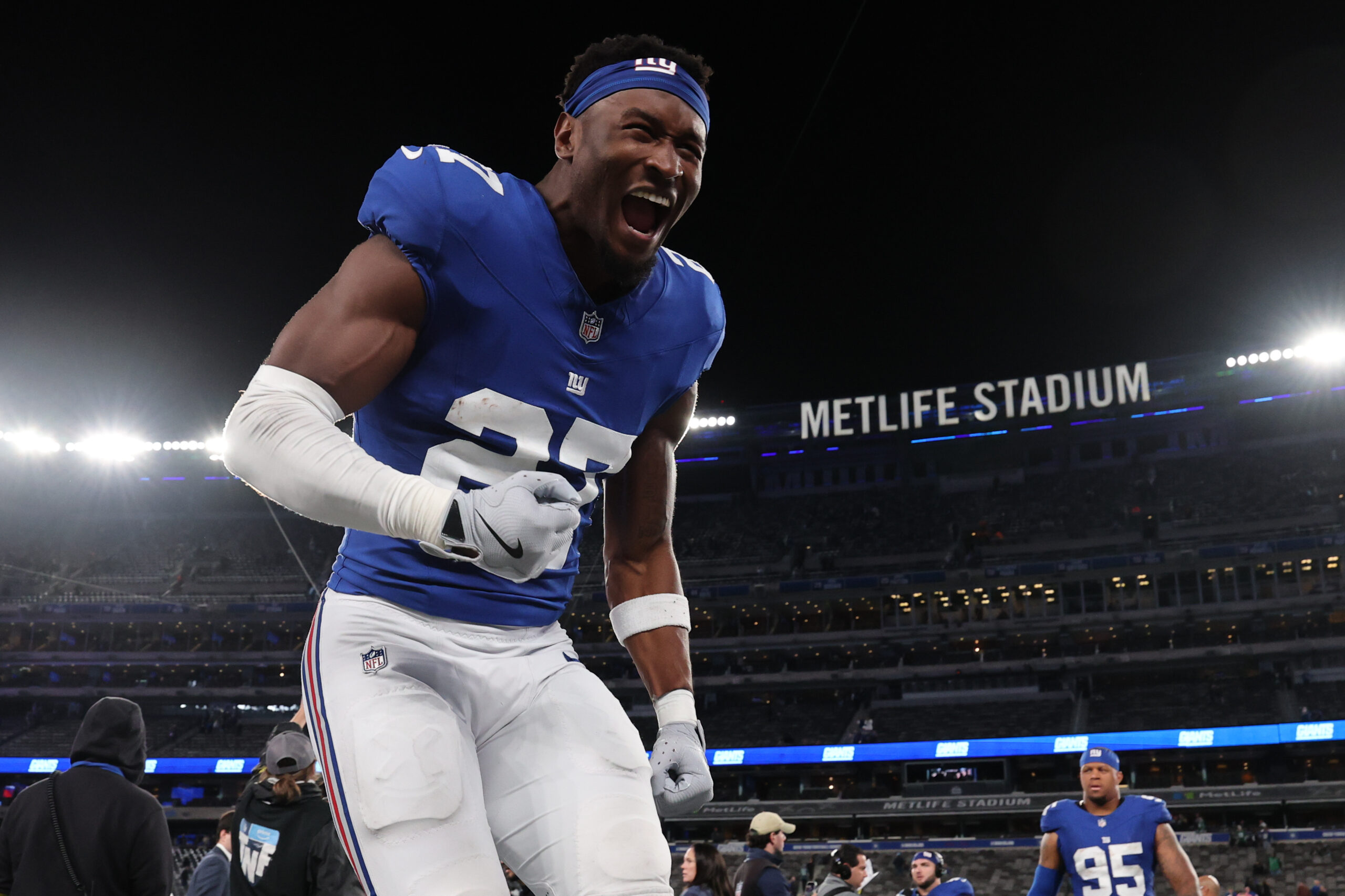 Oct 9, 2025; East Rutherford, New Jersey, USA; New York Giants safety Tyler Nubin (27) celebrates after defeating the Philadelphia Eagles at MetLife Stadium. Mandatory Credit: Vincent Carchietta-Imagn Images