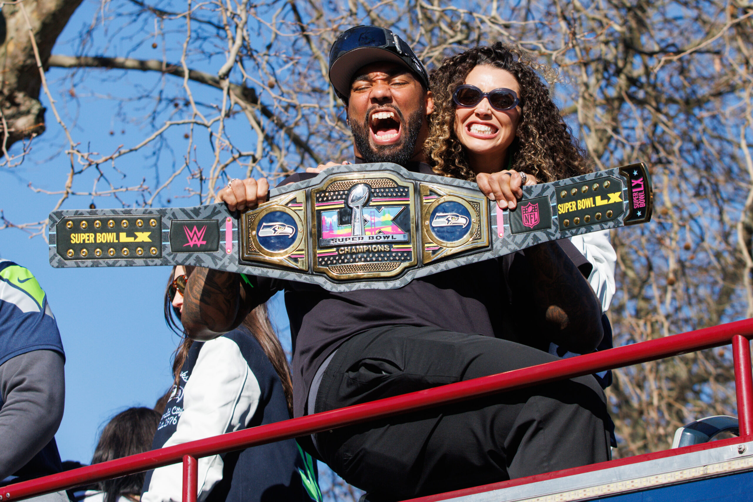 Feb 11, 2026; Seattle, WA, USA; Seattle Seahawks defensive end Leonard Williams (99) during the Super Bowl LX parade. Mandatory Credit: Kevin Ng-Imagn Images