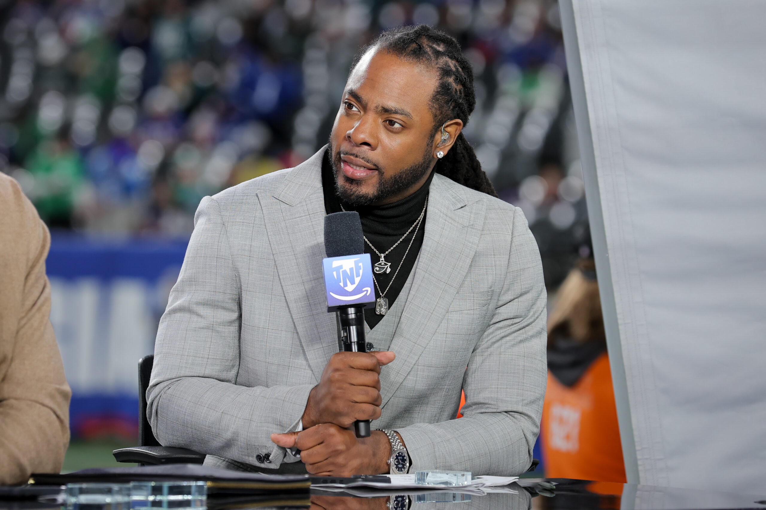 Oct 9, 2025; East Rutherford, New Jersey, USA; Richard Sherman is seen on the Thursday Night Football set before the game between the New York Giants and the Philadelphia Eagles at MetLife Stadium. Mandatory Credit: Brad Penner-Imagn Images