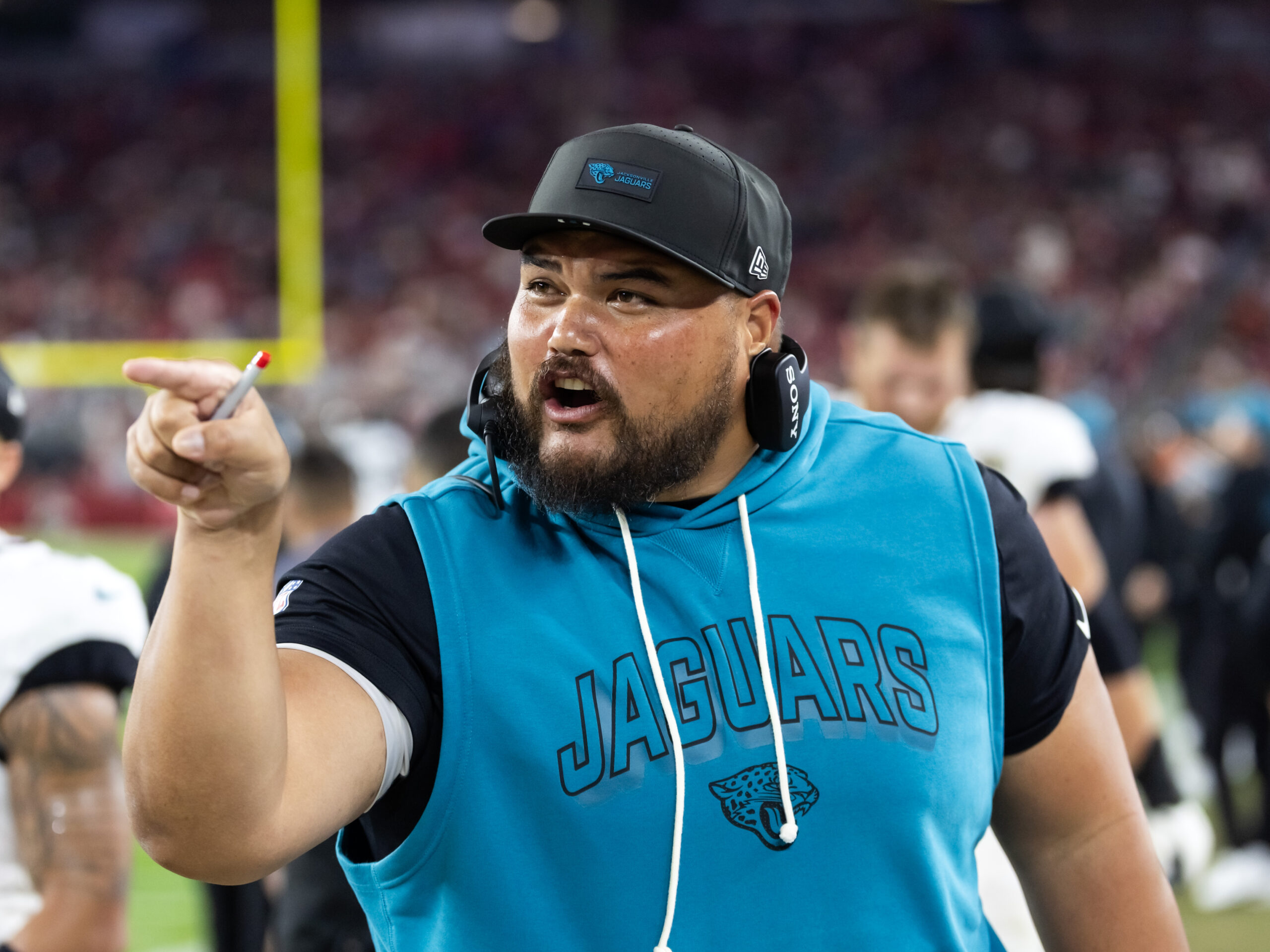 Nov 23, 2025; Glendale, Arizona, USA; Jacksonville Jaguars assistant offensive line coach Keli’i Kekuewa against the Arizona Cardinals at State Farm Stadium. Mandatory Credit: Mark J. Rebilas-Imagn Images