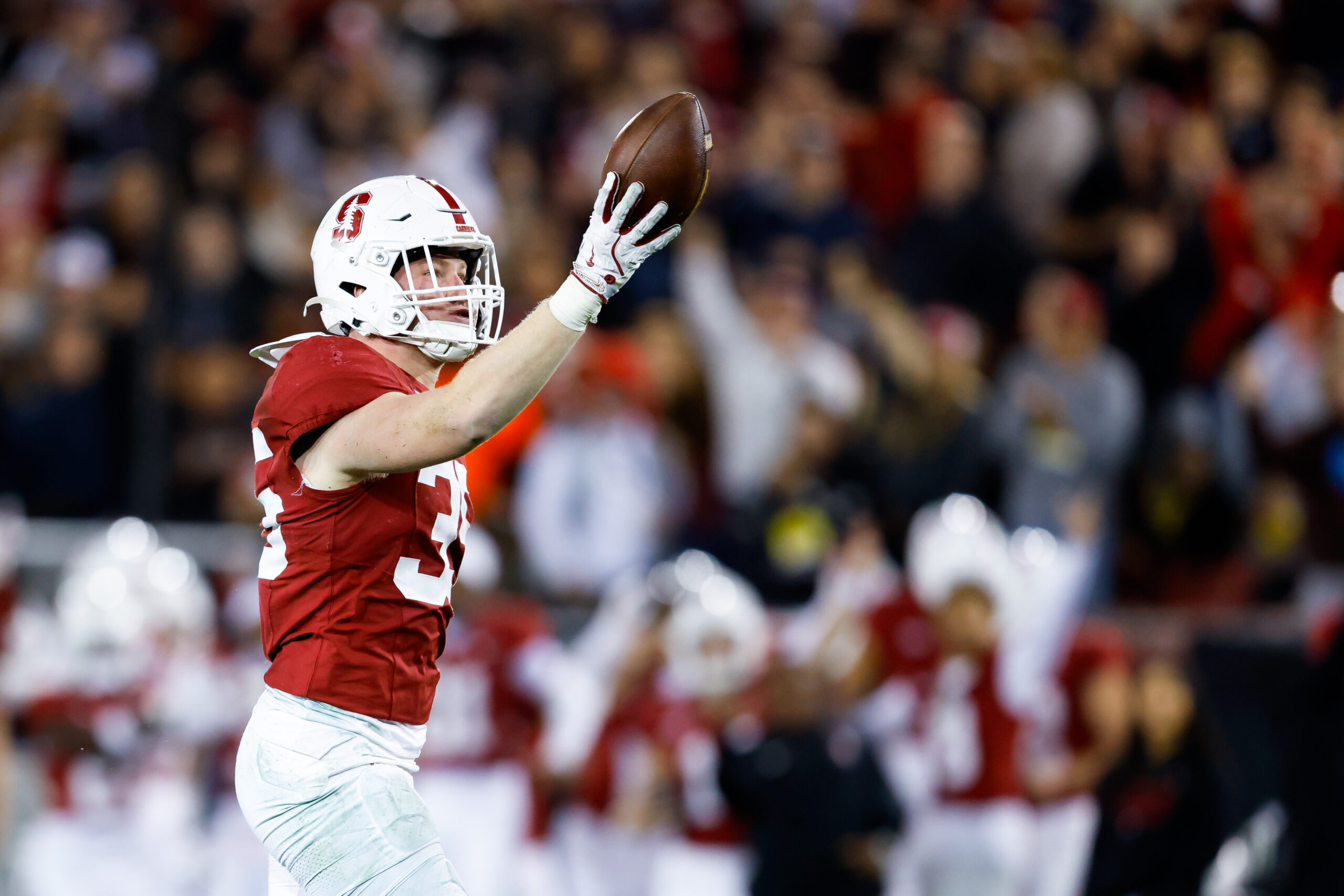 Nov 22, 2025; Stanford, California, USA; Stanford Cardinal linebacker Matt Rose (35) celebrates after recovering a fumble by California Golden Bears quarterback Jaron-Keawe Sagapolutele (3) during the fourth quarter at Stanford Stadium. Mandatory Credit: Sergio Estrada-Imagn Images