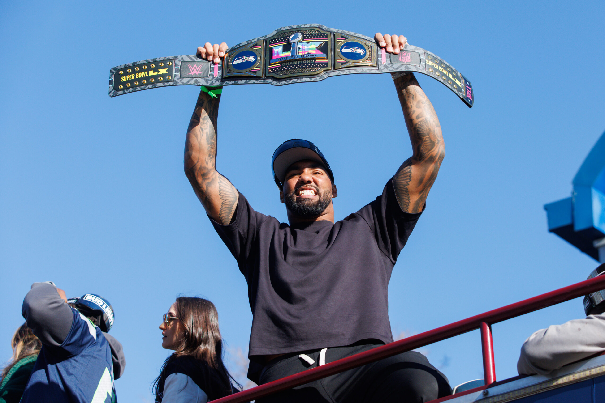 Feb 11, 2026; Seattle, WA, USA; Seattle Seahawks defensive end Leonard Williams (99) reacts during the Super Bowl LX parade. Mandatory Credit: Kevin Ng-Imagn Images