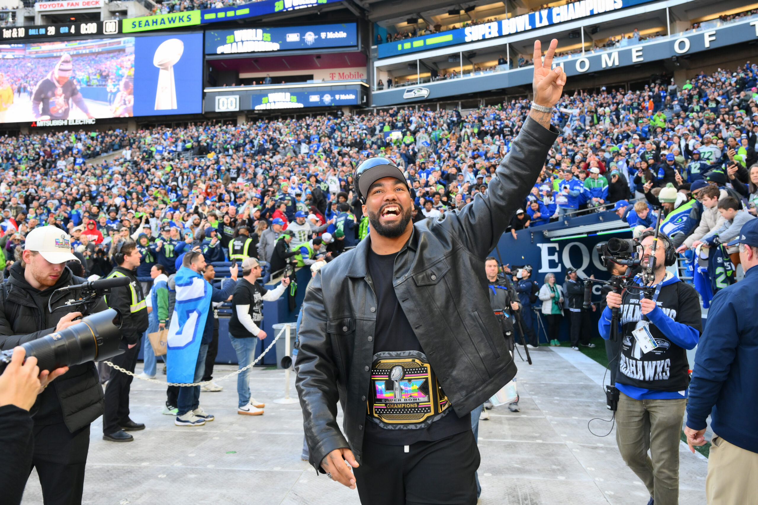 Feb 11, 2026; Seattle, WA, USA; Seattle Seahawks defensive end Leonard Williams (99) before the Super Bowl LX trophy presentation at Lumen Field. Mandatory Credit: Steven Bisig-Imagn Images