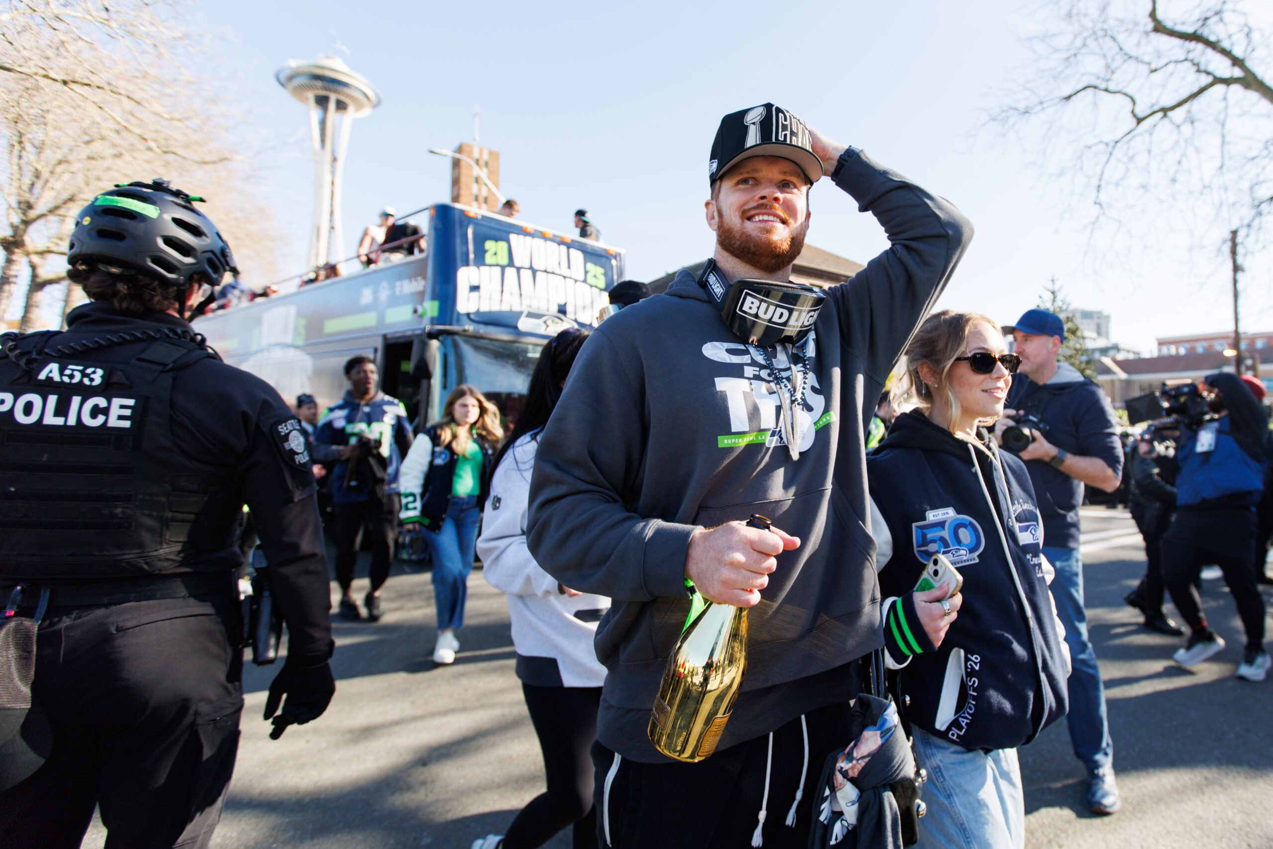 Feb 11, 2026; Seattle, WA, USA; Seattle Seahawks quarterback Sam Darnold (14) reacts during the Super Bowl LX parade. Mandatory Credit: Kevin Ng-Imagn Images