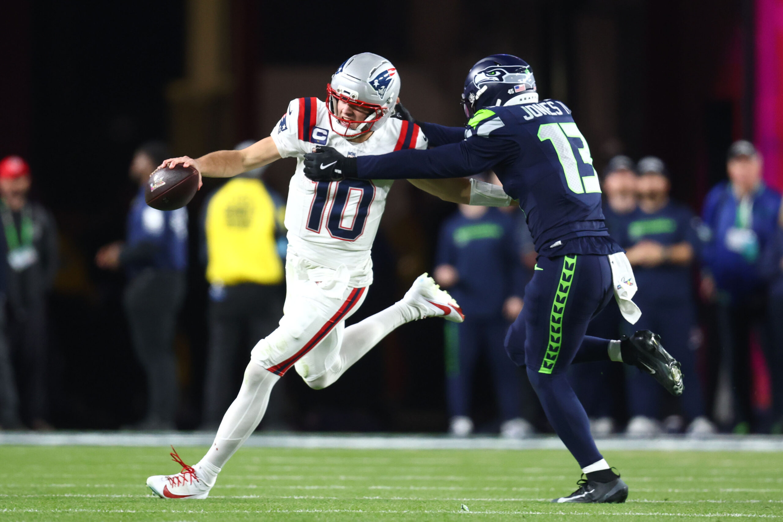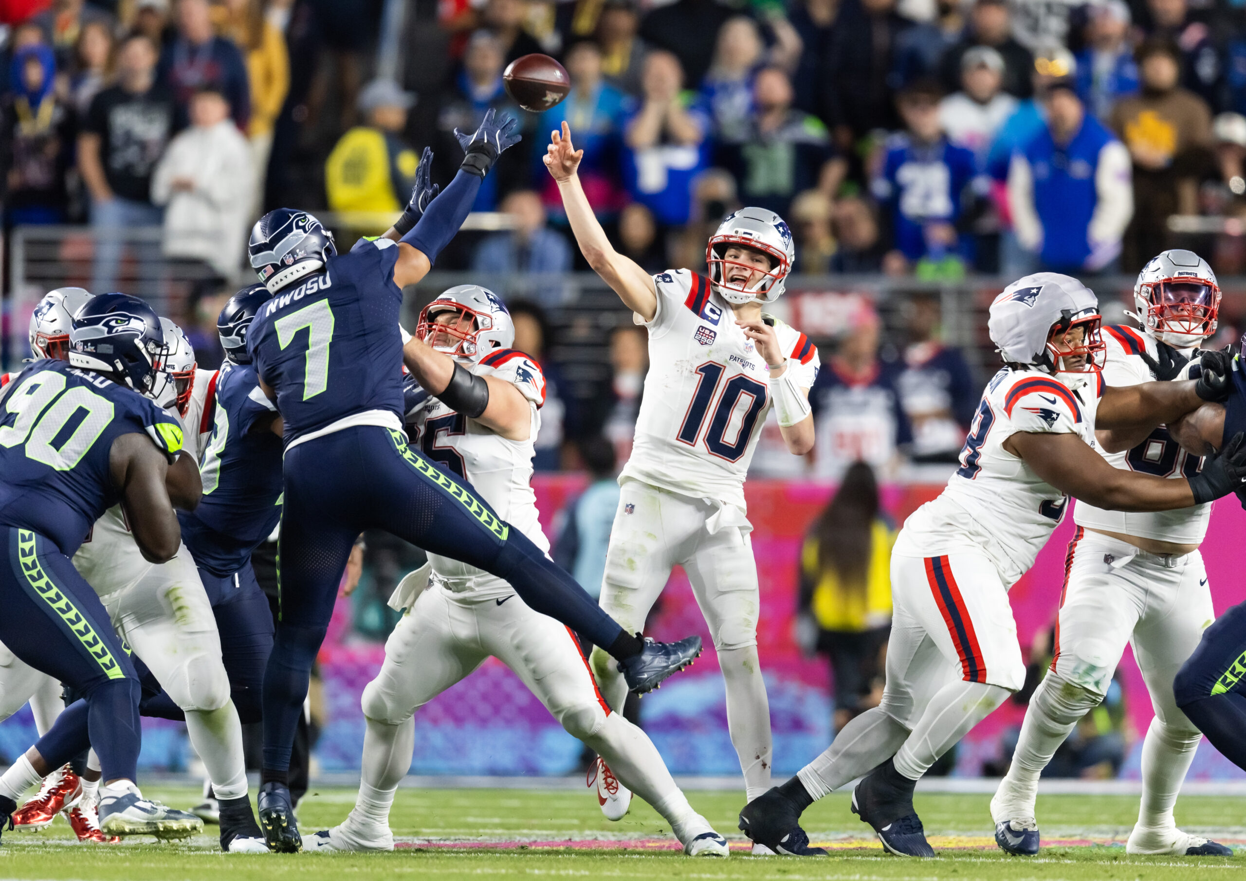 Feb 8, 2026; Santa Clara, CA, USA; New England Patriots quarterback Drake Maye (10) throws a pass under pressure from Seattle Seahawks linebacker Uchenna Nwosu (7) during Super Bowl LX at Levi’s Stadium. Mandatory Credit: Mark J. Rebilas-Imagn Images