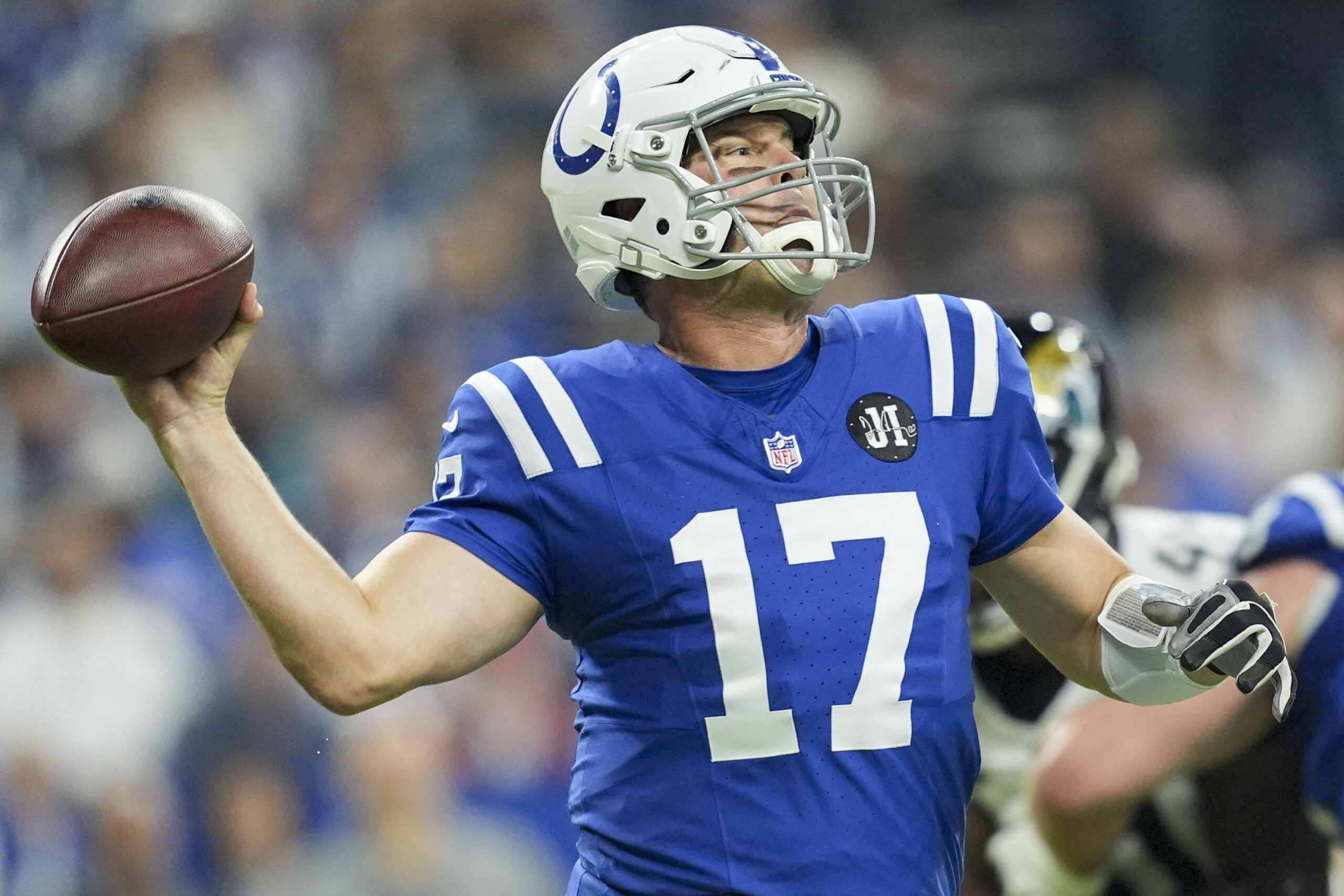 Dec 28, 2025; Indianapolis, Indiana, USA; Indianapolis Colts wide receiver Michael Pittman Jr. (11) draws back to pass during a game against the Jacksonville Jaguars at Lucas Oil Stadium. Mandatory Credit: Mykal McEldowney-USA TODAY Network via Imagn Images