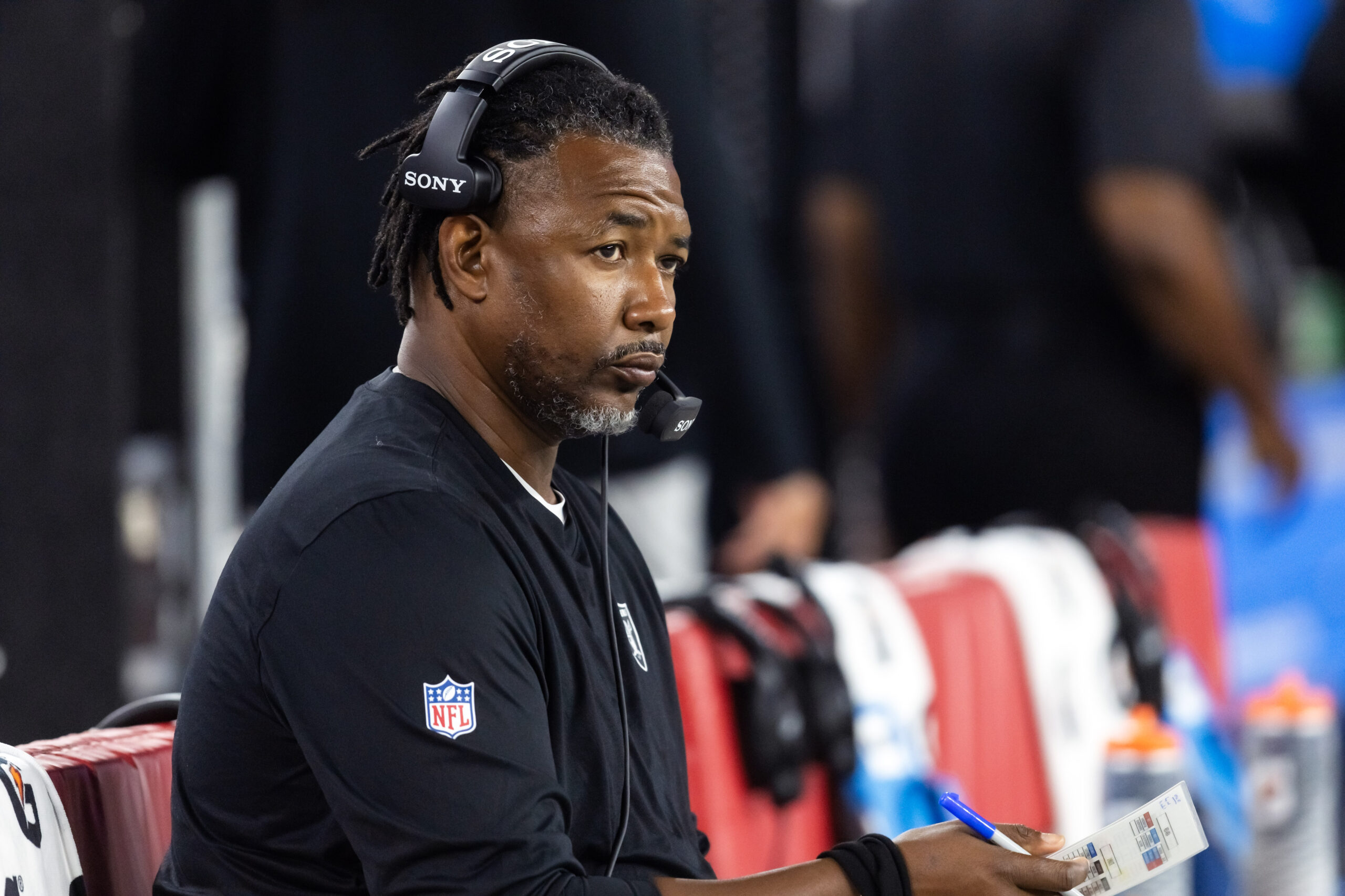 Aug 23, 2025; Glendale, Arizona, USA; Las Vegas Raiders defensive coordinator Patrick Graham against the Arizona Cardinals during a preseason NFL game at State Farm Stadium. Mandatory Credit: Mark J. Rebilas-Imagn Images