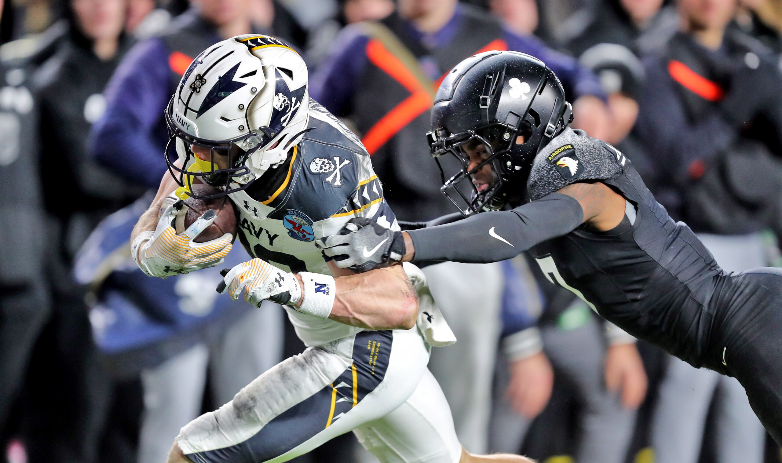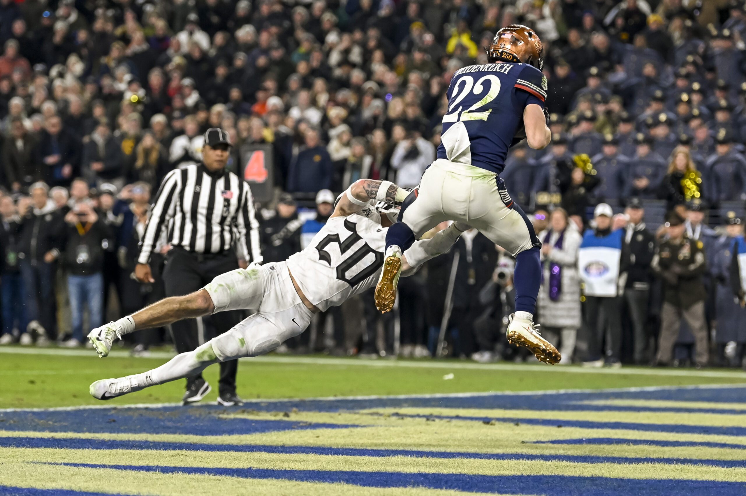 Dec 13, 2025; Baltimore, Maryland, USA; Navy Midshipmen running back Eli Heidenreich (22) catches a touchdown in front of Army West Point Black Knights safety Casey Larkin (20) during the second half at M&T Bank Stadium. Mandatory Credit: Tommy Gilligan-Imagn Images