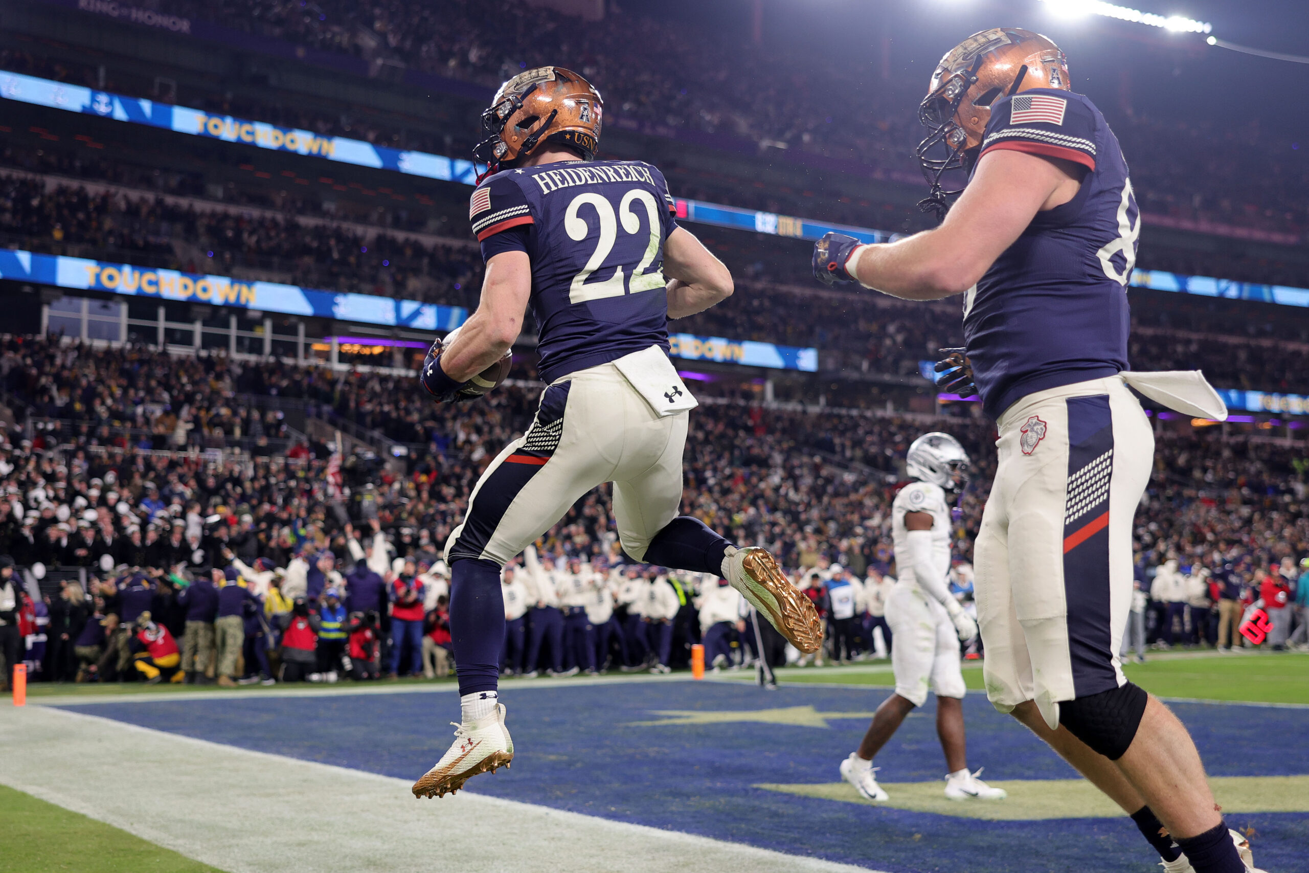 Dec 13, 2025; Baltimore, Maryland, USA; Navy Midshipmen wide receiver Eli Heidenreich (22) reacts after scoring a touchdown against the Army Black Knights during the second half at M&T Bank Stadium. Mandatory Credit: Mike Dinovo-Imagn Images