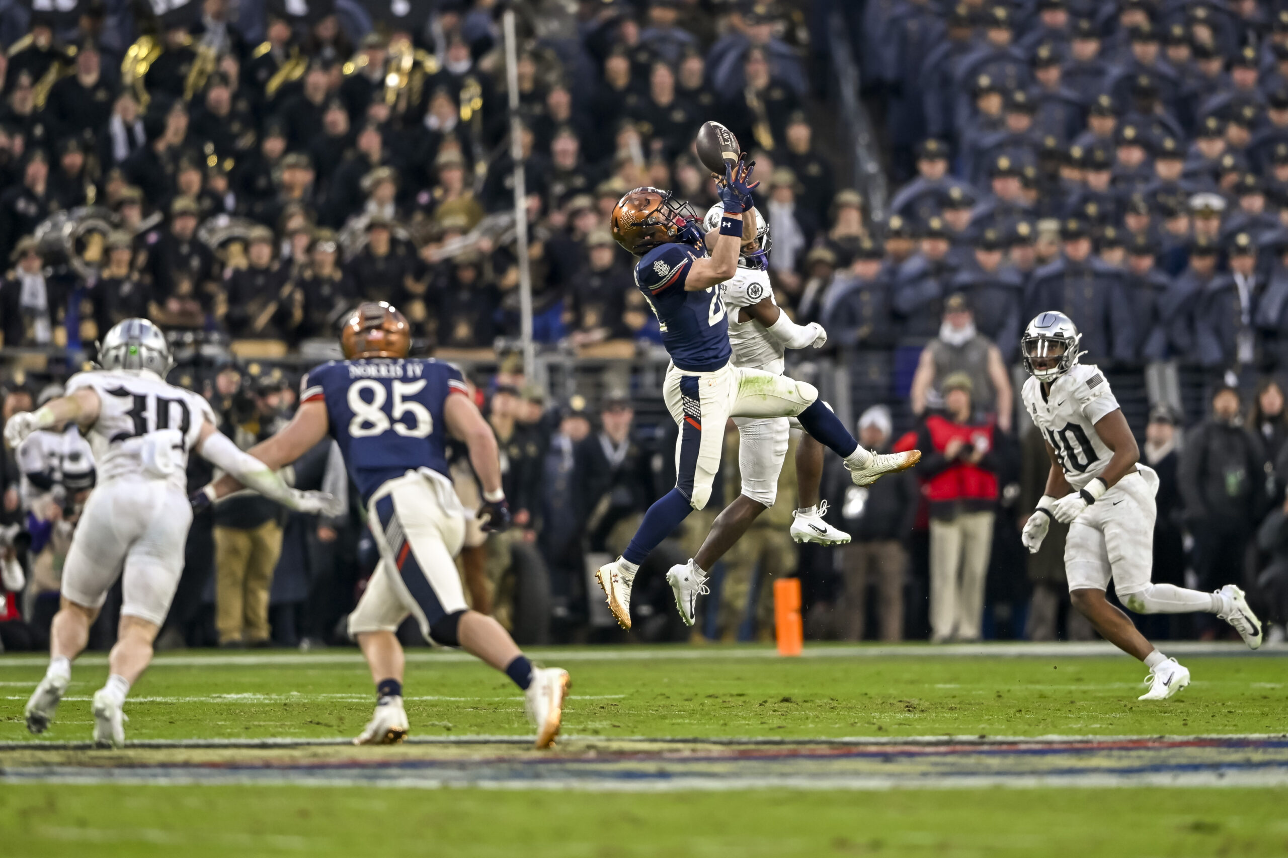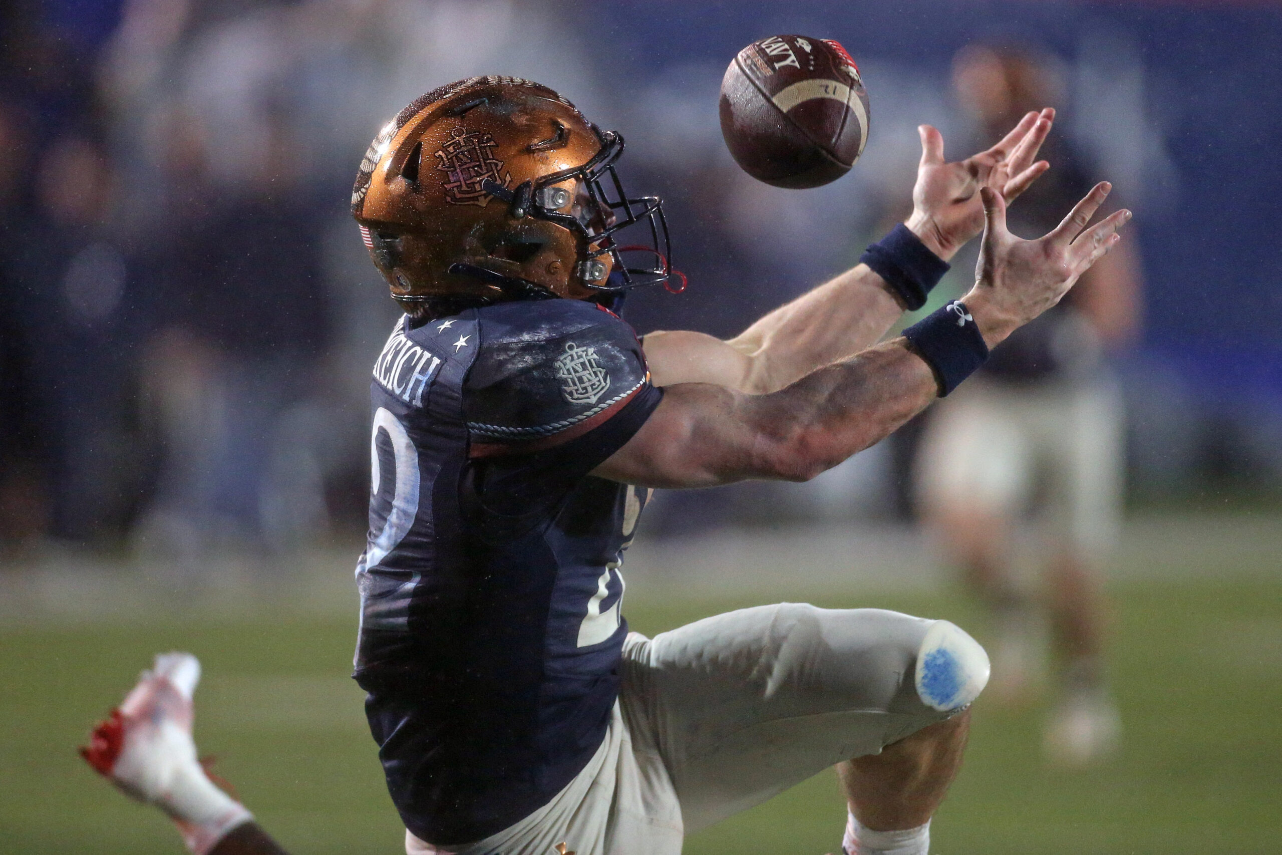 Dec 13, 2025; Baltimore, Maryland, USA; Navy Midshipmen running back Eli Heidenreich (22) leaps the catch a pass during the game against the Army West Point Black Knights at M&T Bank Stadium. Mandatory Credit: Tommy Gilligan-Imagn Images