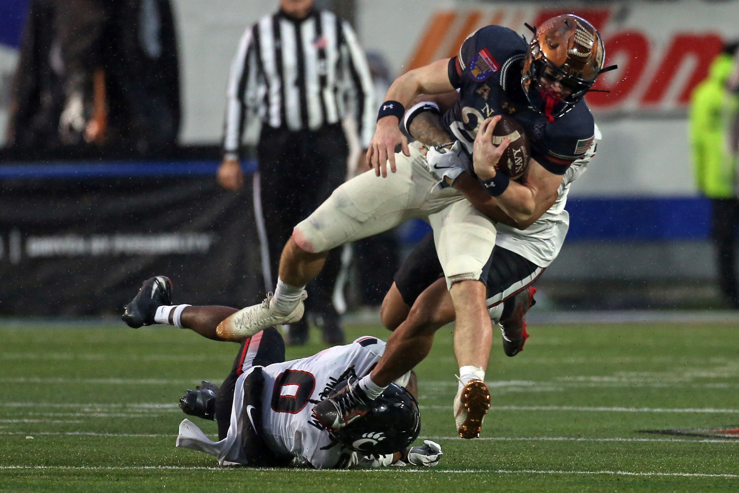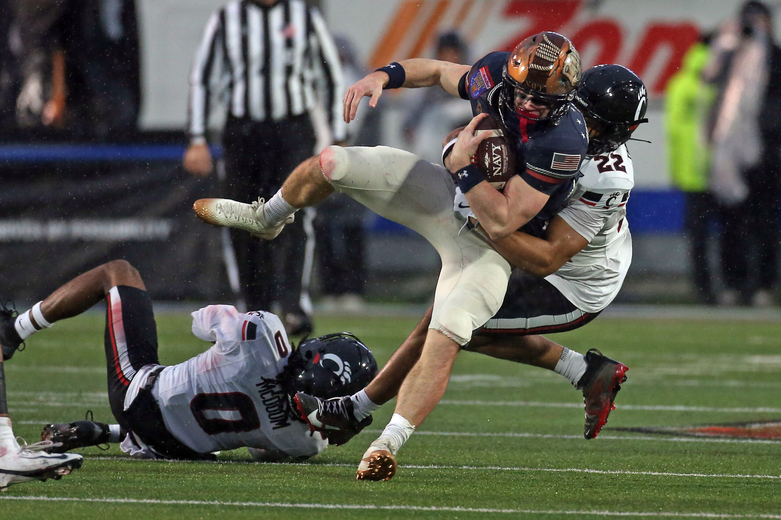 Jan 2, 2026; Memphis, TN, USA; Navy Midshipmen slotback Eli Heidenreich (22) runs after a catch as Cincinnati Bearcats linebacker Jonathan Thompson (22) makes the tackle during the second quarter at Simmons Bank Liberty Stadium. Mandatory Credit: Petre Thomas-Imagn Images