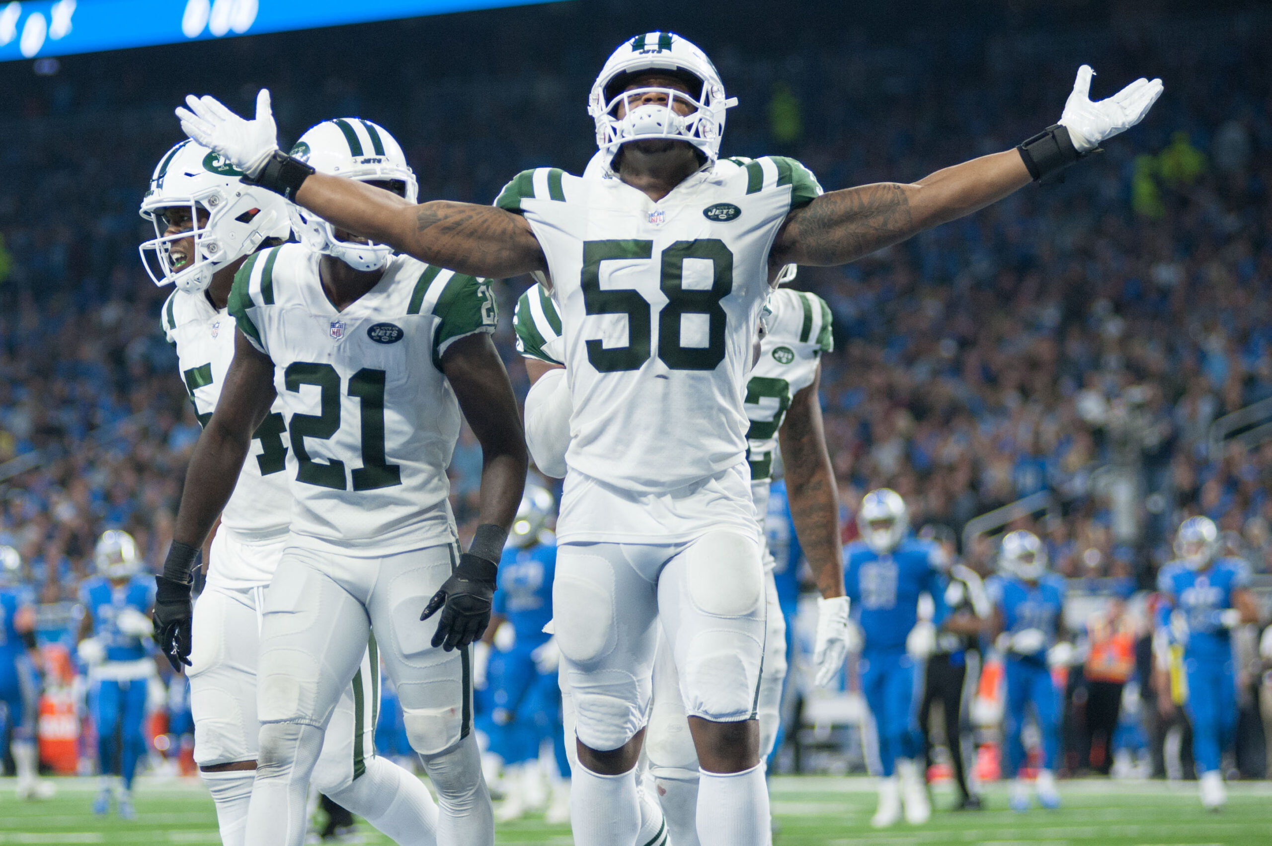 Sep 10, 2018; Detroit, MI, USA; New York Jets linebacker Darron Lee (58) celebrates his touchdown during the third quarter against the Detroit Lions at Ford Field. Mandatory Credit: Tim Fuller-Imagn Images