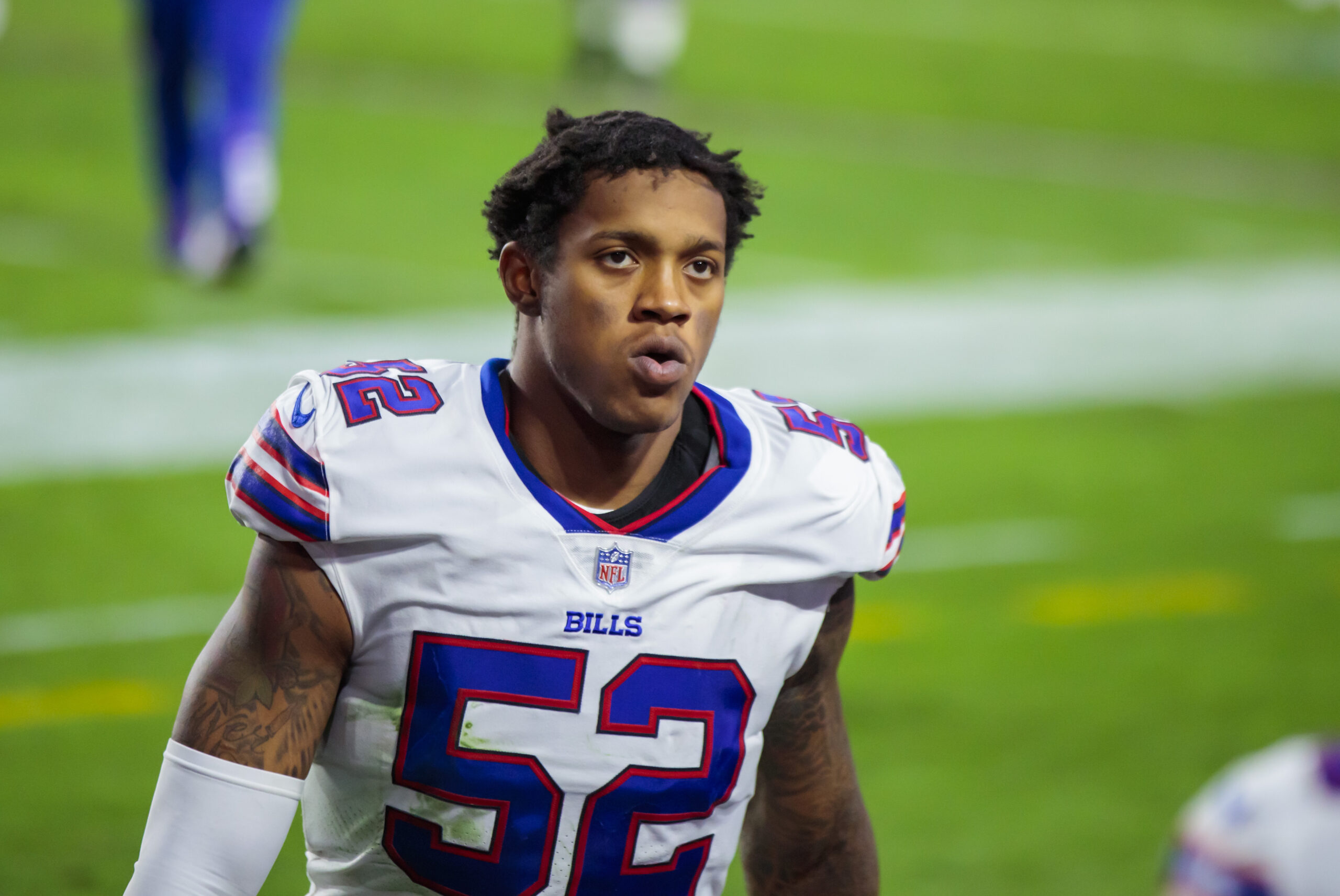 Nov 15, 2020; Glendale, Arizona, USA; Buffalo Bills linebacker Darron Lee (52) against the Arizona Cardinals at State Farm Stadium. Mandatory Credit: Mark J. Rebilas-Imagn Images