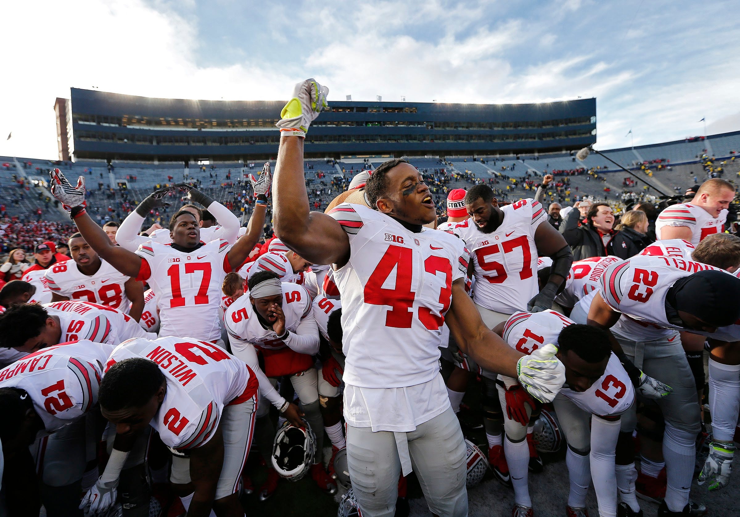 Ohio State Buckeyes linebacker Darron Lee (43) pumps his fist after singing Carmen Ohio following the 42-13 win over Michigan in the NCAA football game at Michigan Stadium in Ann Arbor on Nov. 28, 2015.