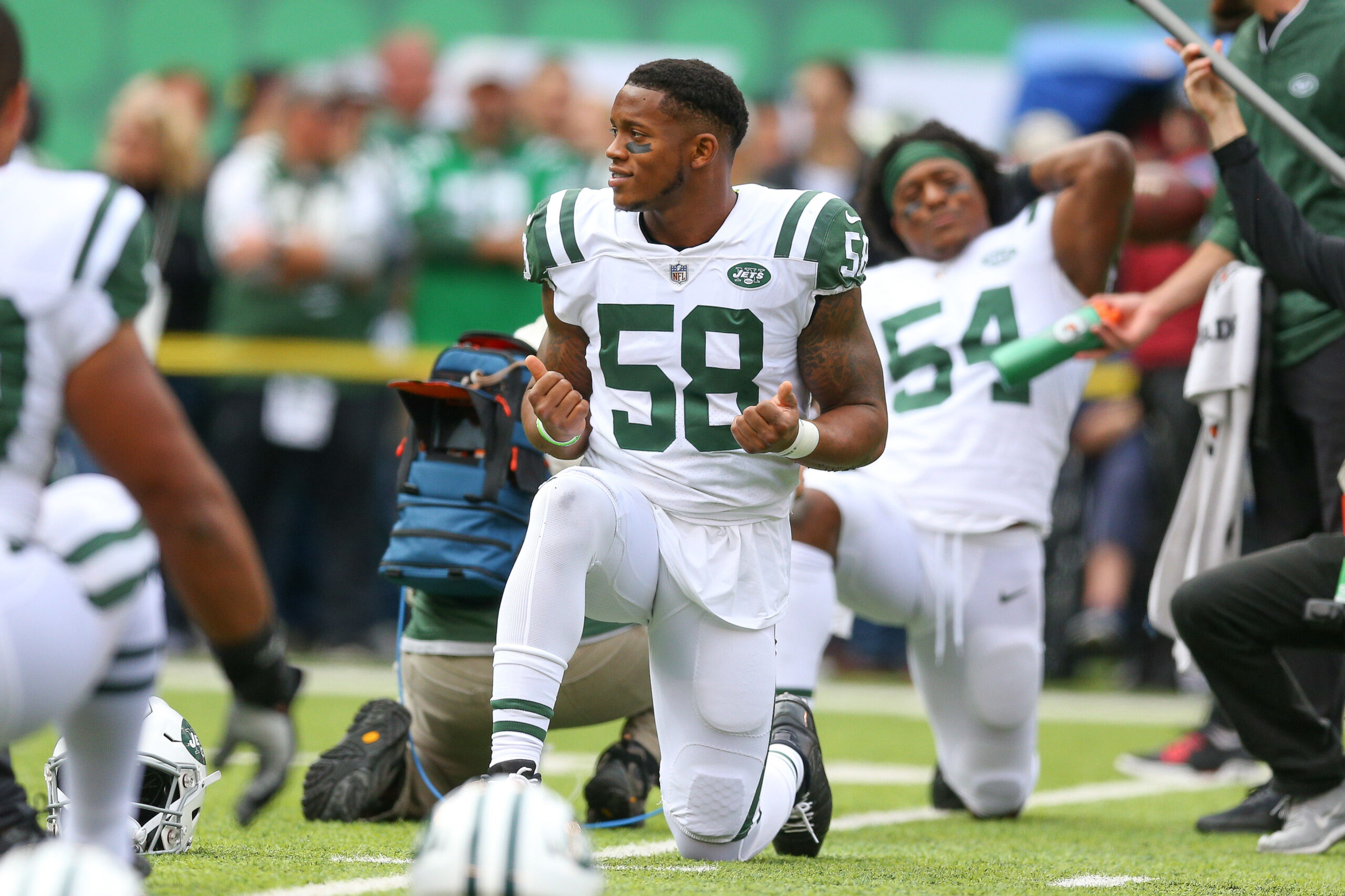 Oct 14, 2018; East Rutherford, NJ, USA; New York Jets inside linebacker Darron Lee (58) warms up before his game against the Indianapolis Colts during the second half at MetLife Stadium. Mandatory Credit: Vincent Carchietta-Imagn Images