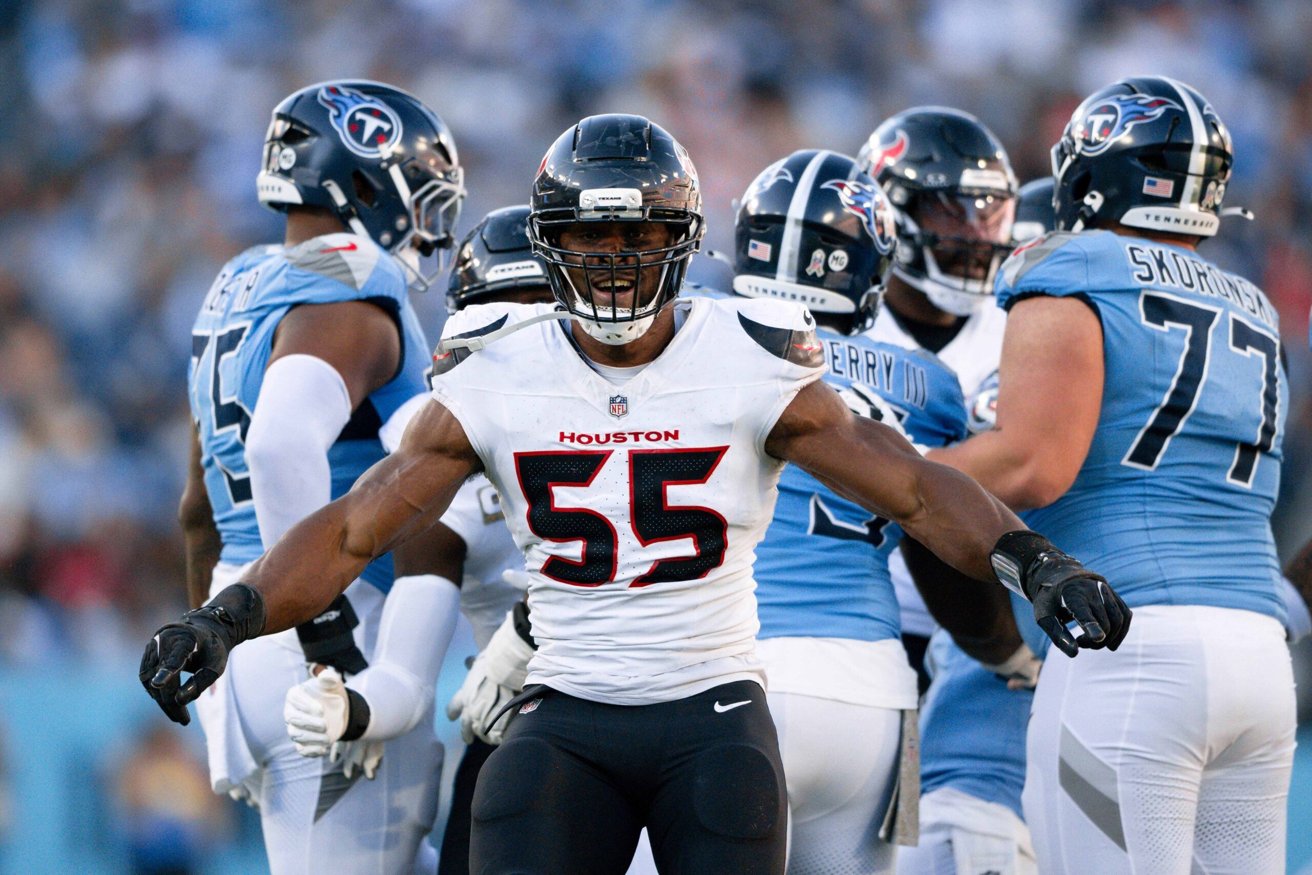 Nov 16, 2025; Nashville, Tennessee, USA; Houston Texans defensive end Danielle Hunter (55) celebrates after the sack of Tennessee Titans quarterback Cameron Ward (1) during the second half at Nissan Stadium. Mandatory Credit: Steve Roberts-Imagn Images