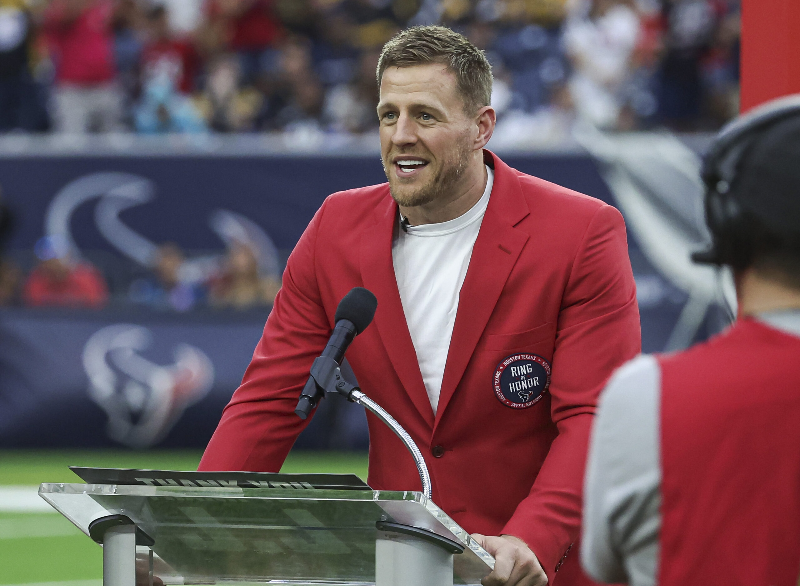 Oct 1, 2023; Houston, Texas, USA; Former Houston Texans player J.J. Watt speaks to the crowd after being inducted into the Texans Ring of Honor during the game against the Pittsburgh Steelers at NRG Stadium. Mandatory Credit: Troy Taormina-Imagn Images