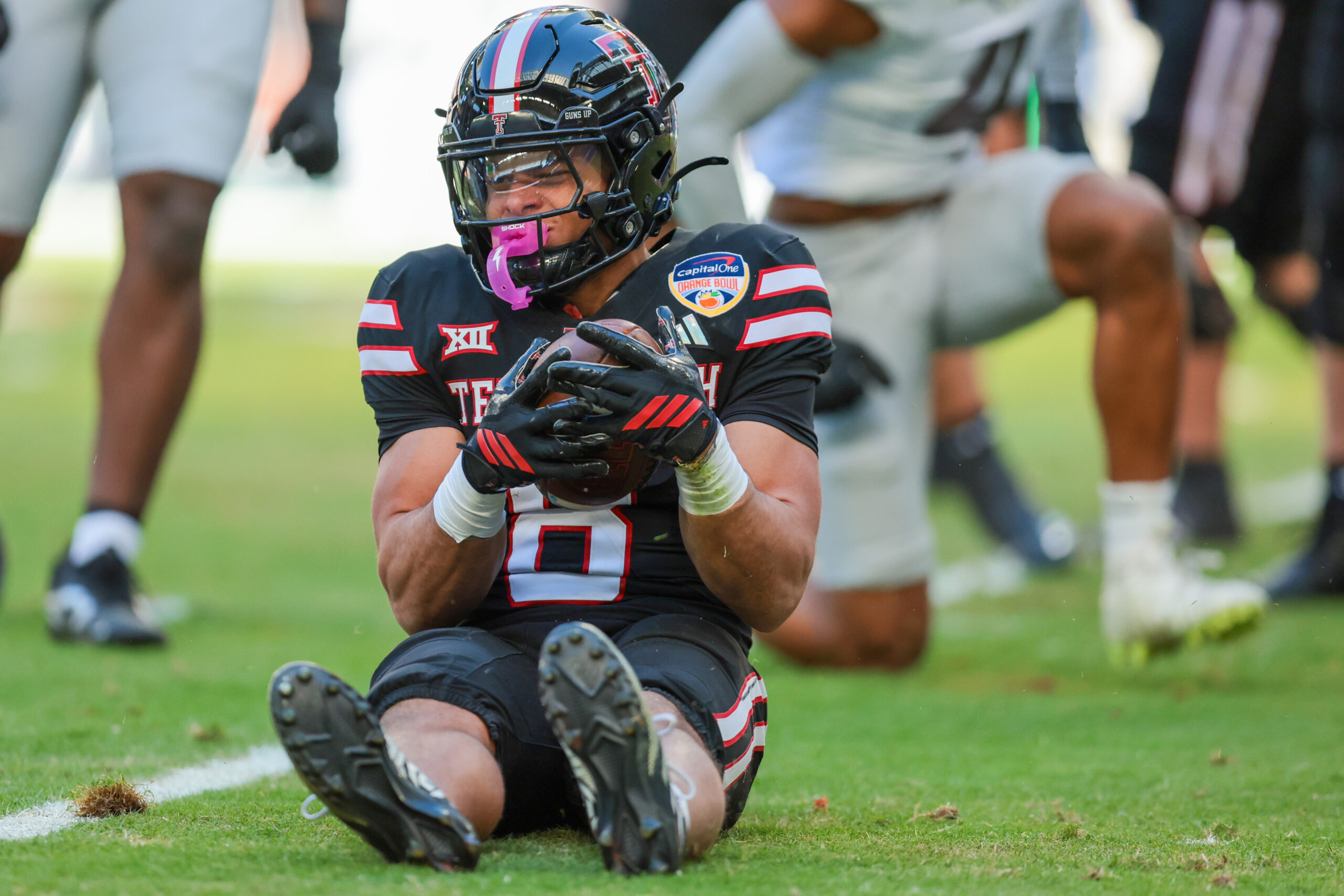 Jan 1, 2026; Miami Gardens, FL, USA; Texas Tech Red Raiders running back Cameron Dickey (8) reacts after a carry against the Oregon Ducks during the first half of the 2025 Orange Bowl and quarterfinal game of the College Football Playoff at Hard Rock Stadium. Mandatory Credit: Sam Navarro-Imagn Images