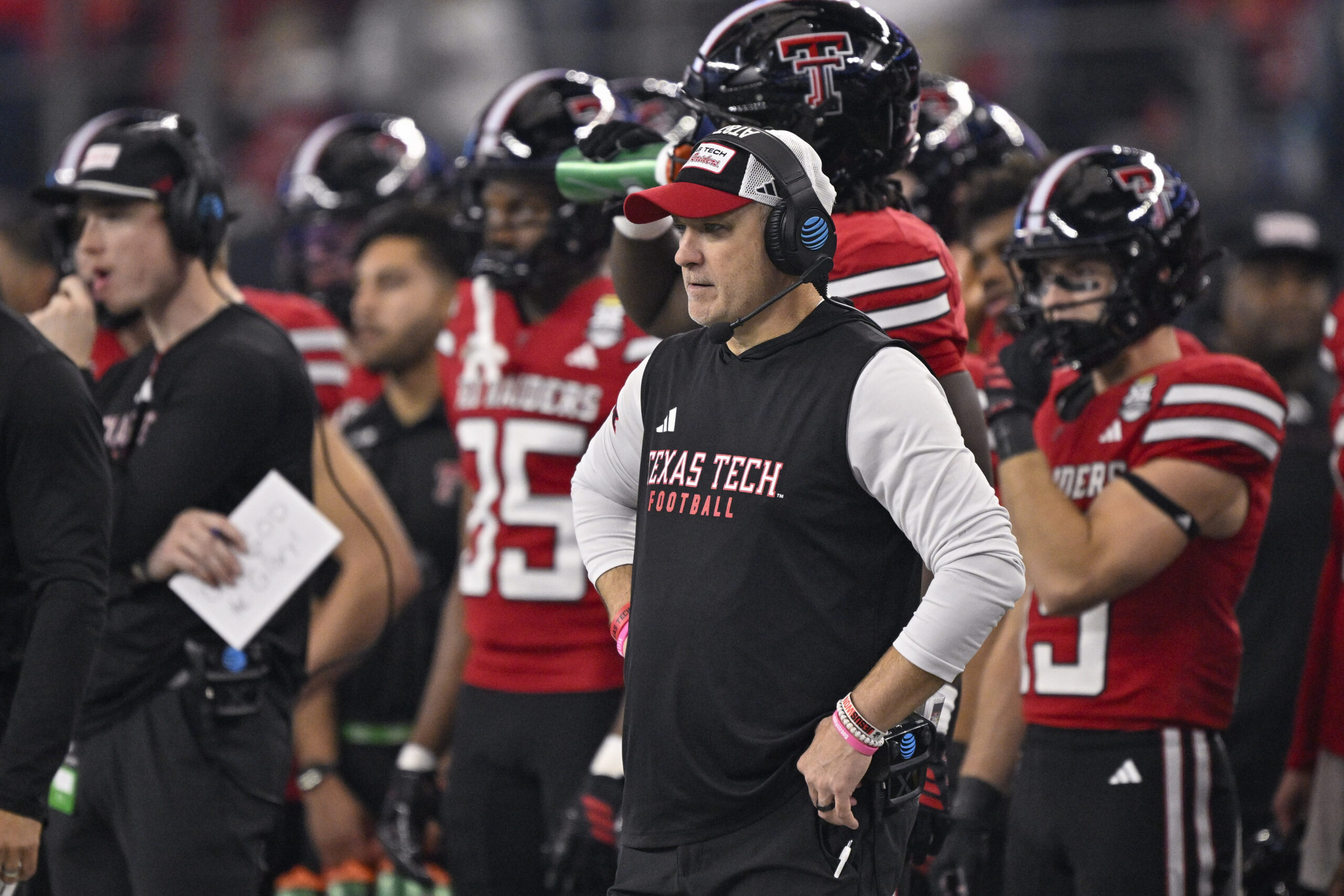 Dec 6, 2025; Arlington, TX, USA; Texas Tech Red Raiders head coach Joey McGuire looks on during the game between the Red Raiders and the Cougars at AT&T Stadium. Mandatory Credit: Jerome Miron-Imagn Images