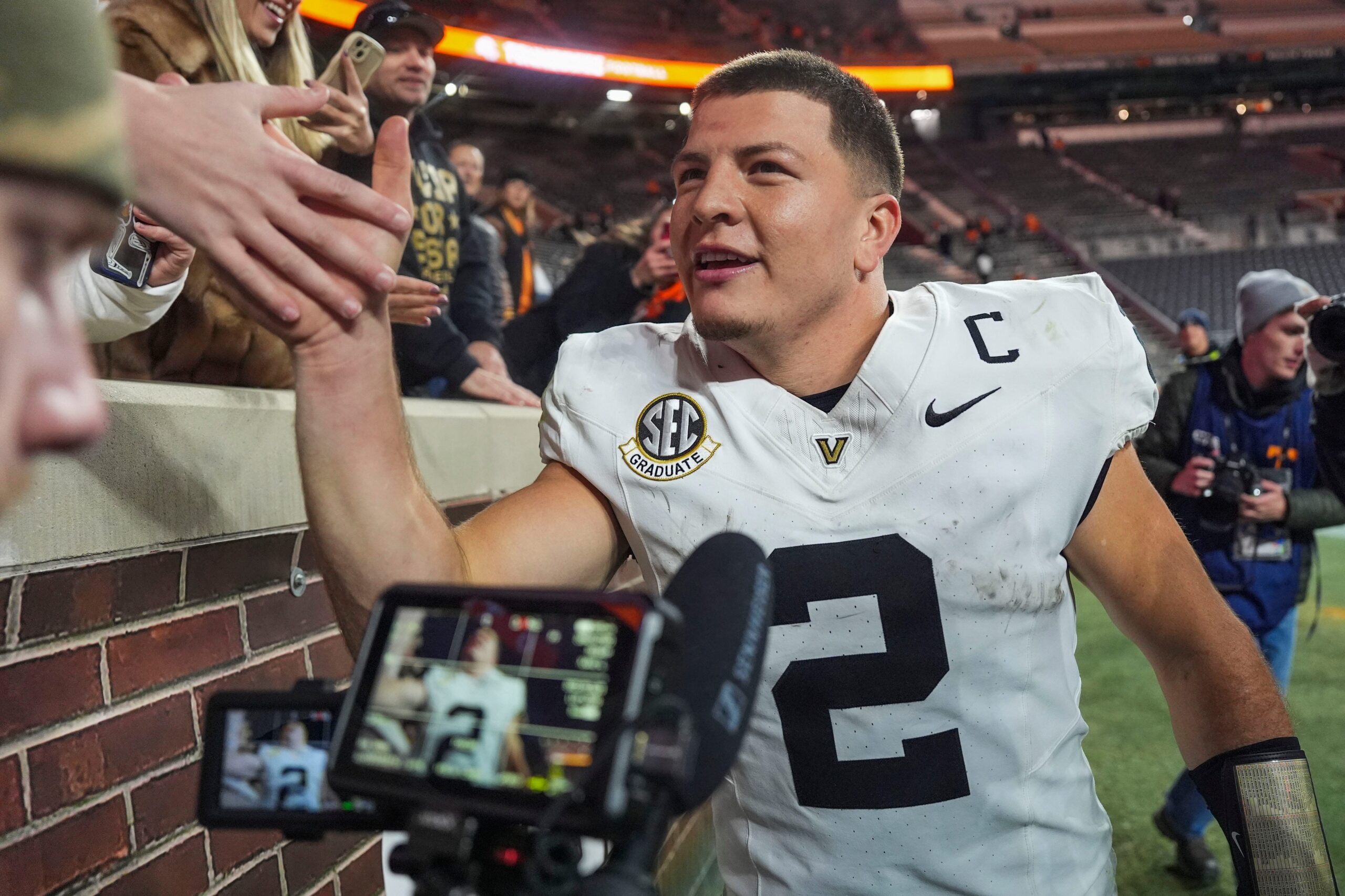 Vanderbilt quarterback Diego Pavia (2) celebrates with fans after winning a NCAA football game between Tennessee and Vanderbilt at Neyland Stadium in Knoxville, Tenn., on Nov. 29, 2025.