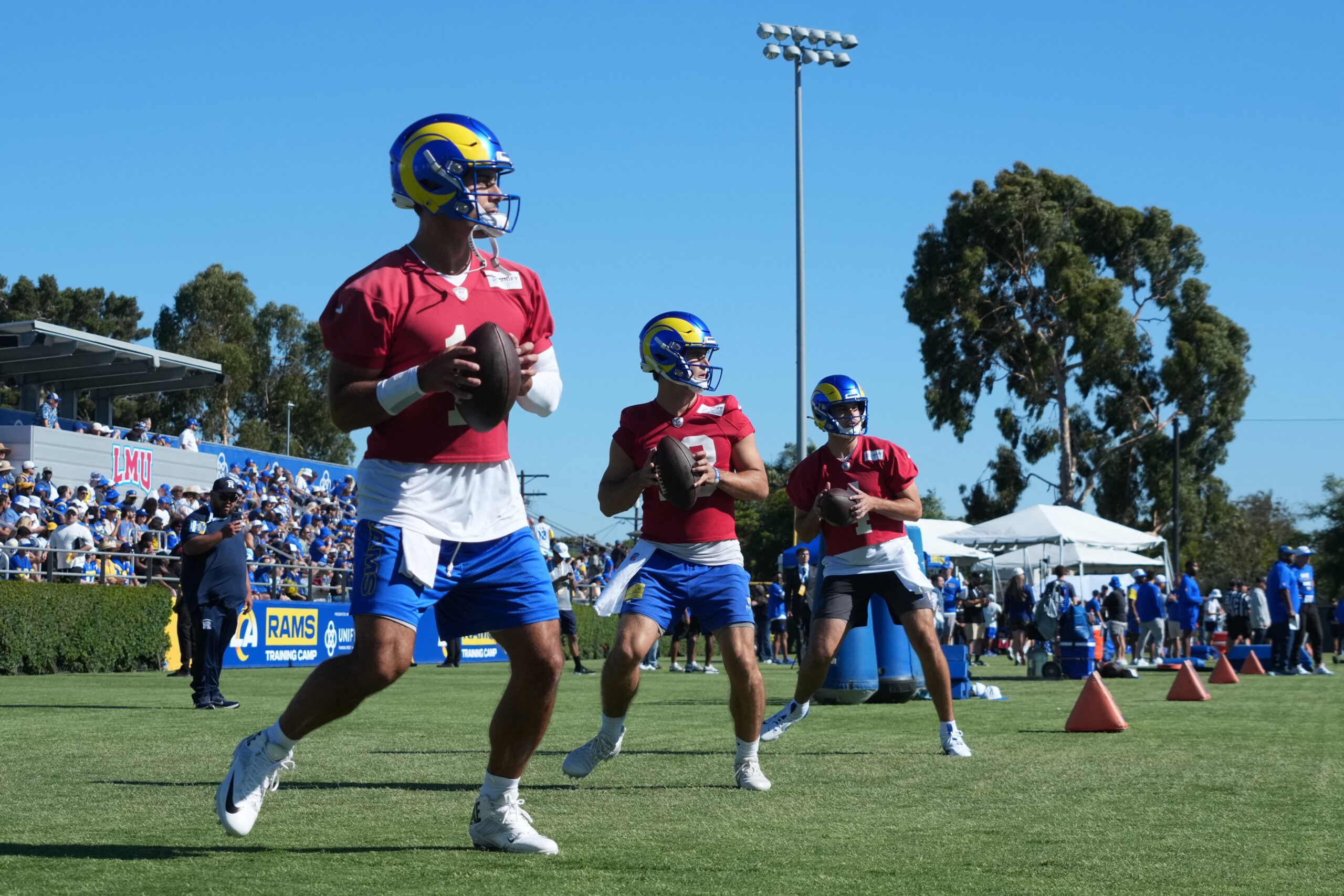 Jul 23, 2025; Los Angeles, CA, USA; Los Angeles Rams quarterbacks Jimmy Garropolo (11), Stetson Bennett (13) and Dresser Winn (4) throw the ball during training camp at Loyola Marymount University. Mandatory Credit: Kirby Lee-Imagn Images