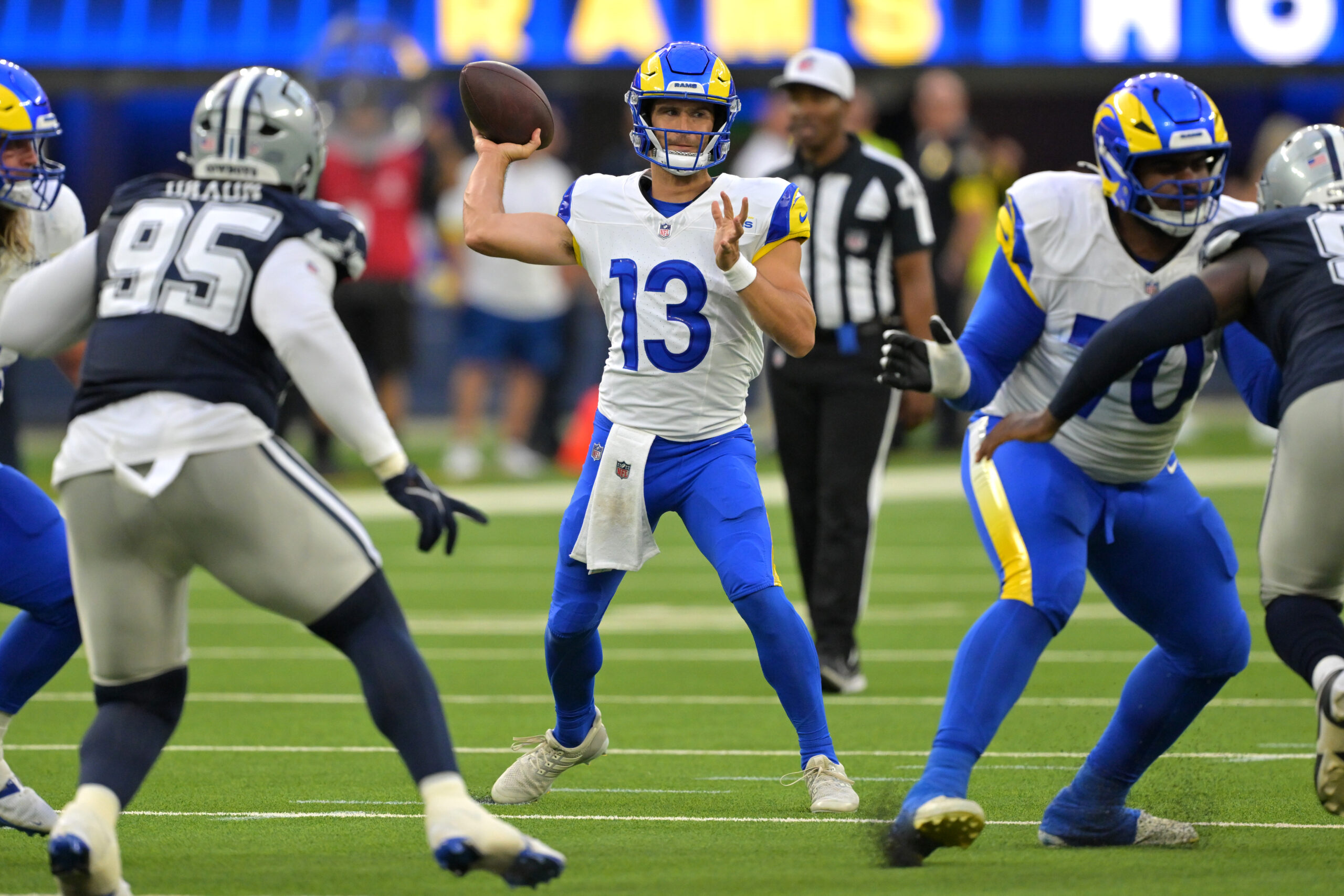 Aug 9, 2025; Inglewood, California, USA; Los Angeles Rams quarterback Stetson Bennett IV (13) throws a pass during the second half against the Dallas Cowboys at SoFi Stadium. Mandatory Credit: Jayne Kamin-Oncea-Imagn Images