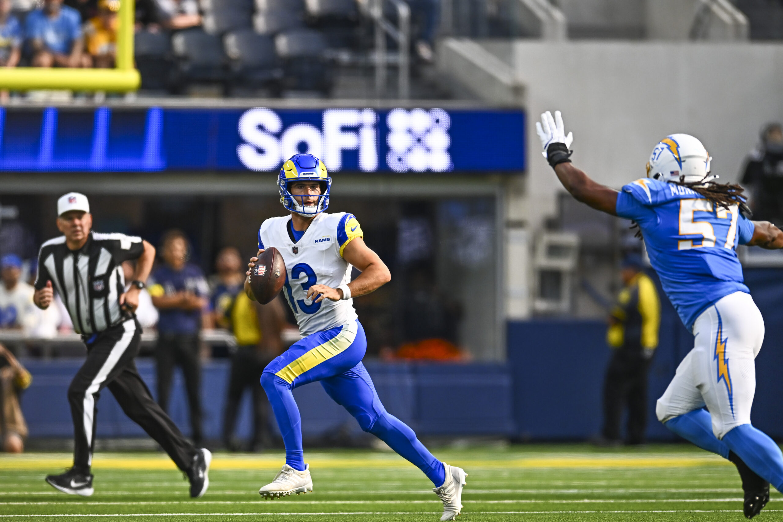 Aug 16, 2025; Inglewood, California, USA; Los Angeles Rams quarterback Stetson Bennett IV (13) looks to pass against Los Angeles Chargers linebacker Tre’Mon Morris-Brash (57) during the second quarter at SoFi Stadium. Mandatory Credit: Jonathan Hui-Imagn Images