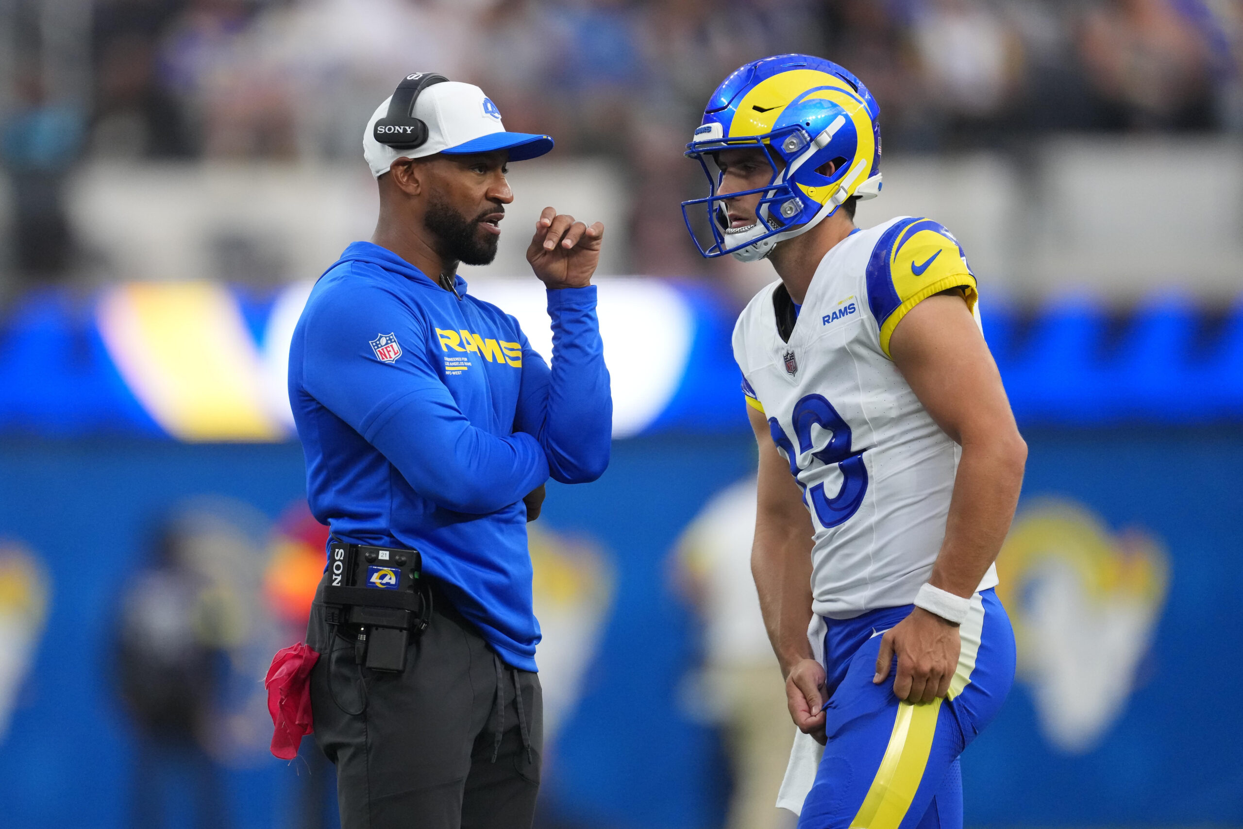 Aug 16, 2025; Inglewood, California, USA; Los Angeles Rams acting head coach Aubrey Pleasant (left) talks with quarterback Stetson Bennett IV (13) in the second half against the Los Angeles Chargers at SoFi Stadium. Mandatory Credit: Kirby Lee-Imagn Images