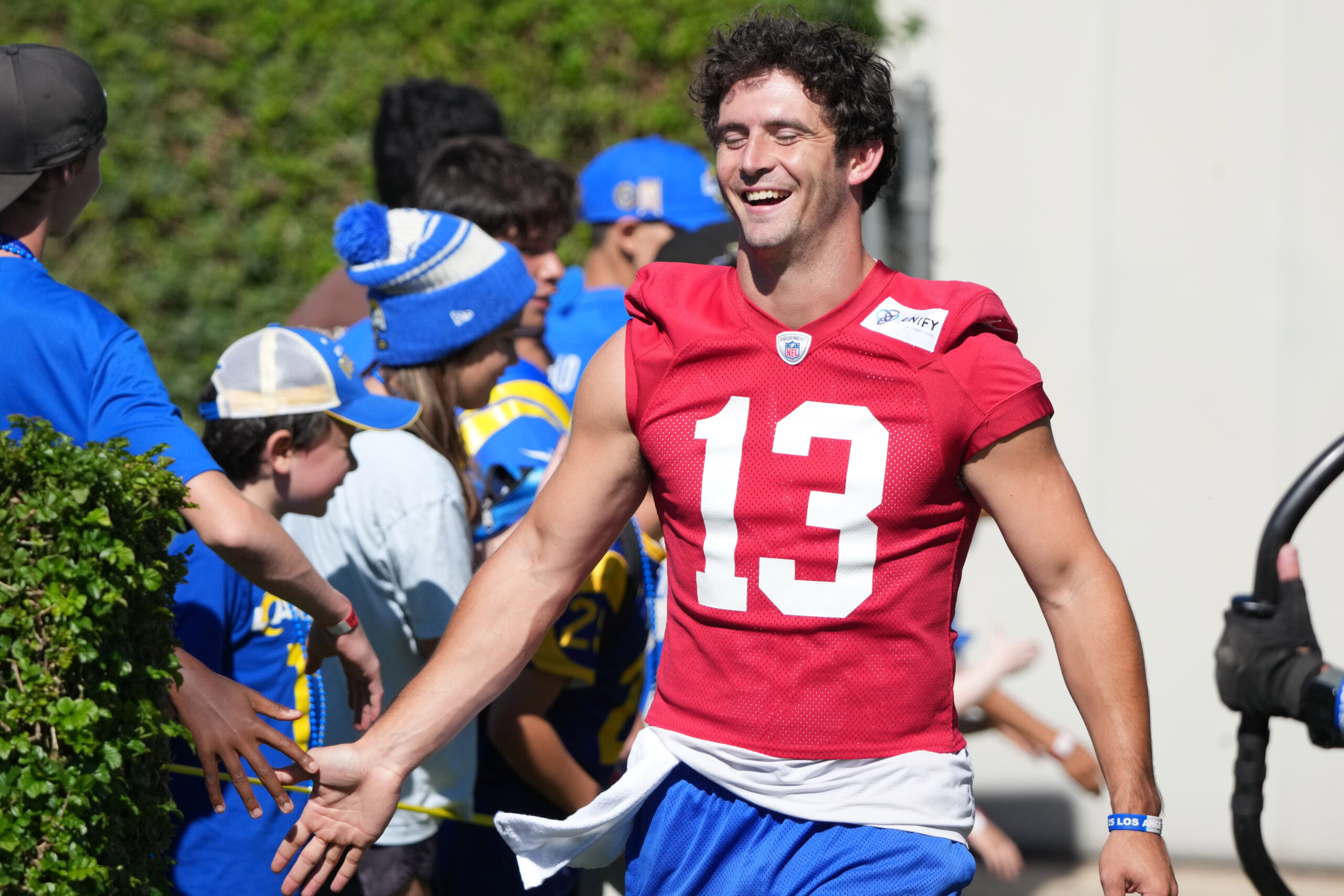 Jul 23, 2025; Los Angeles, CA, USA; Los Angeles Rams quarterback Stetson Bennett (13) during training camp at Loyola Marymount University. Mandatory Credit: Kirby Lee-Imagn Images