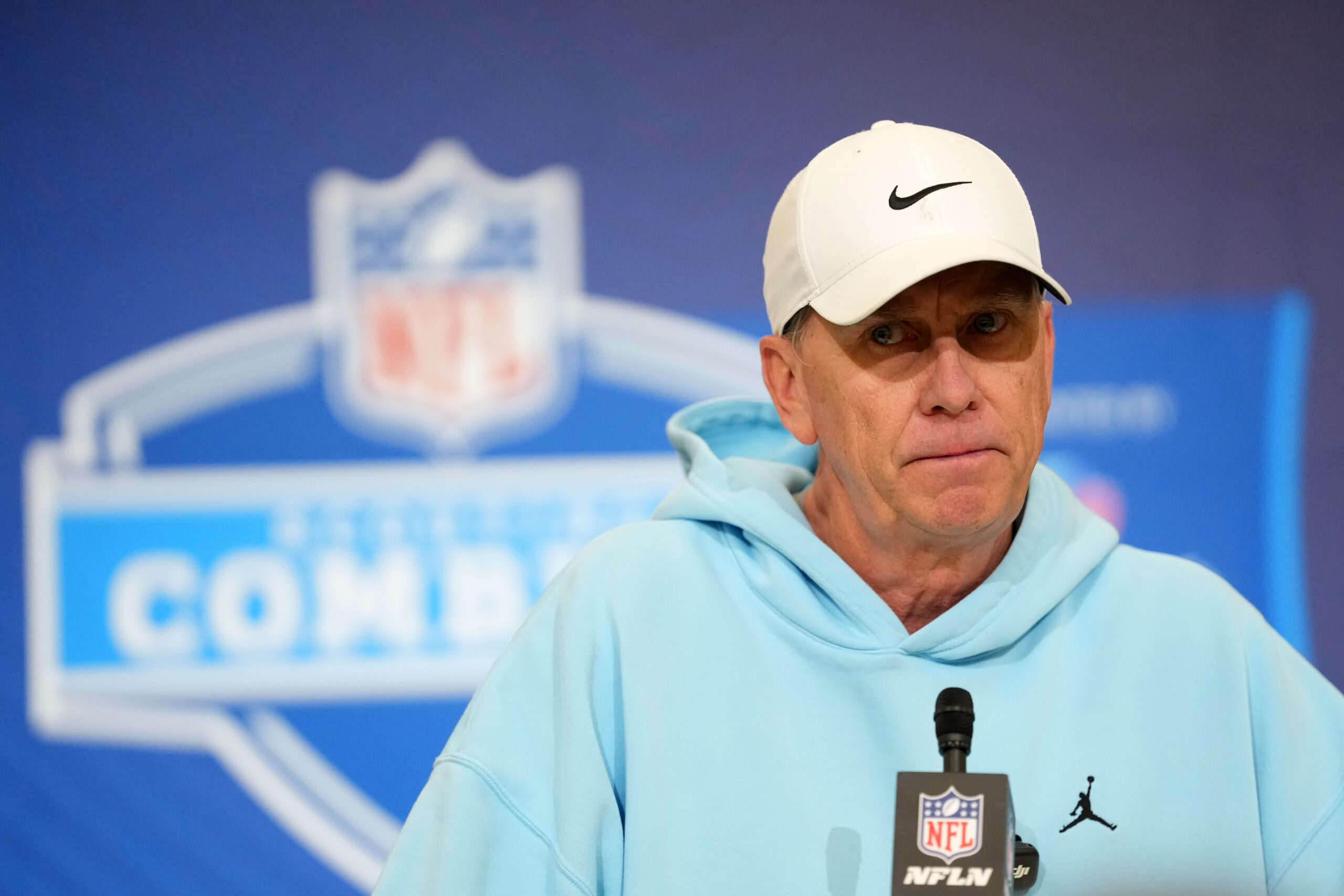 Feb 25, 2026; Indianapolis, IN, USA; Cleveland Browns coach Todd Monken speaks during the NFL Scouting Combine at the Indiana Convention Center. Mandatory Credit: Kirby Lee-Imagn Images