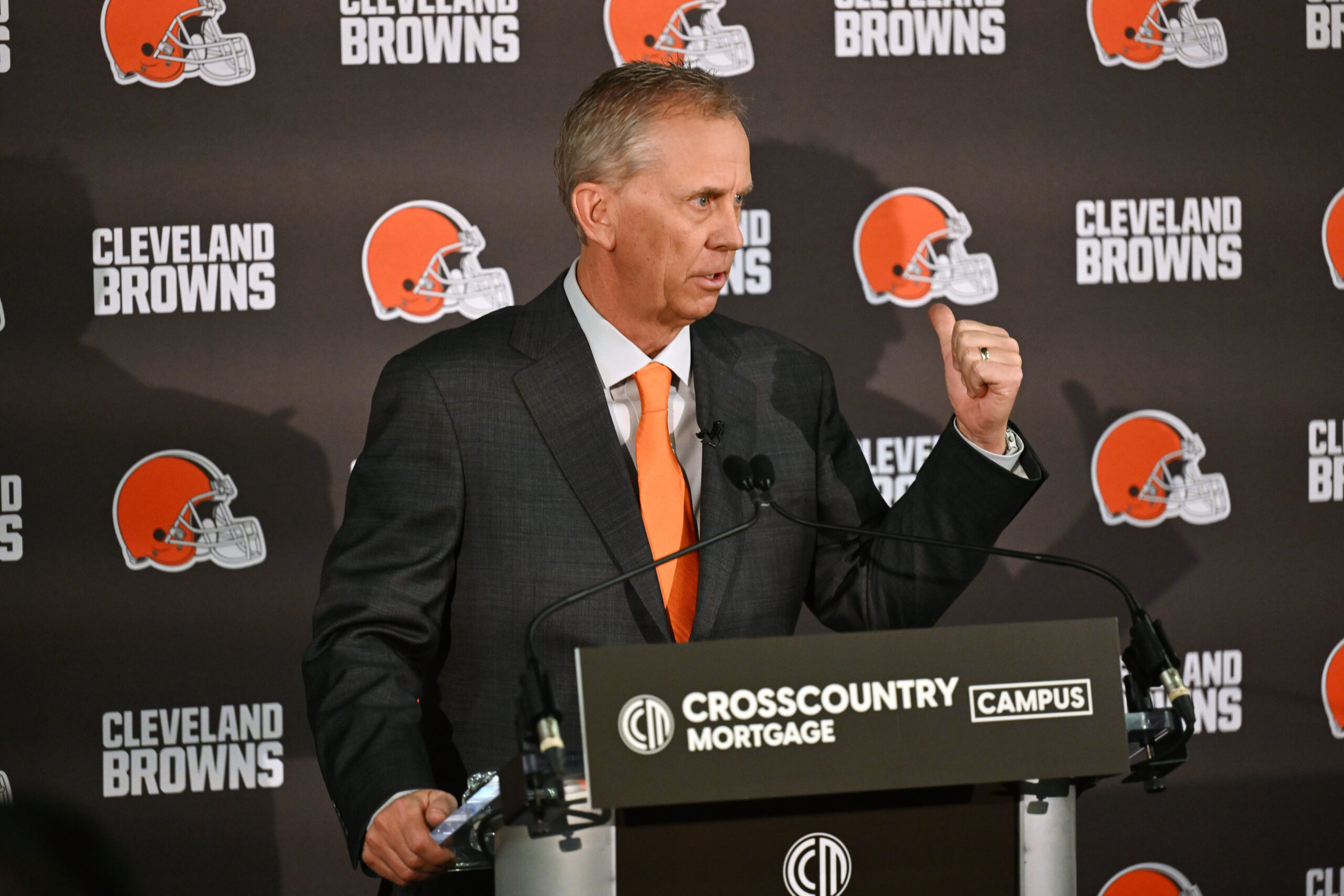 Feb 3, 2026; Berea, OH, USA; Cleveland Browns head coach Todd Monken speaks to the media during an introductory press conference at CrossCountry Mortgage Campus. Mandatory Credit: Ken Blaze-Imagn Images