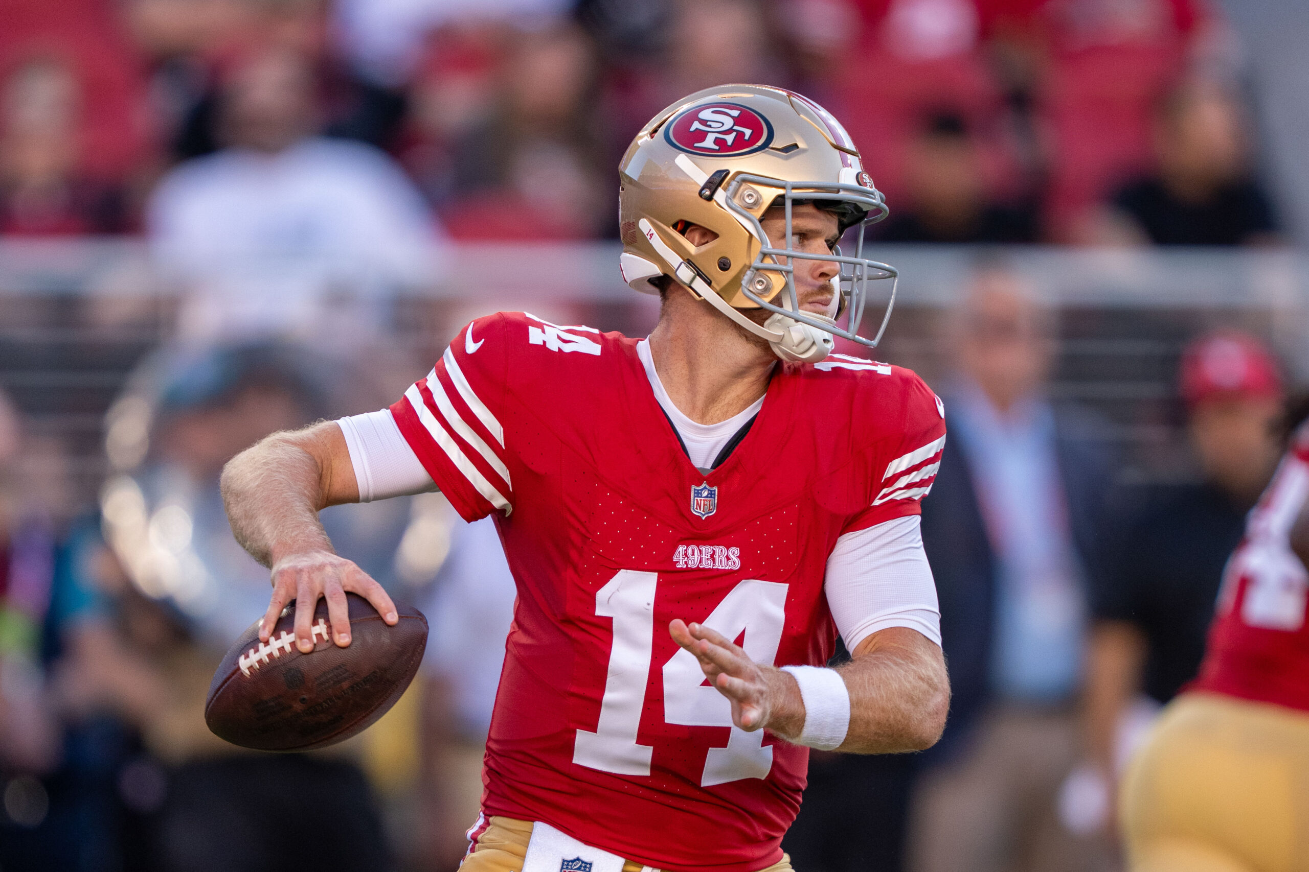 August 19, 2023; Santa Clara, California, USA; San Francisco 49ers quarterback Sam Darnold (14) during the second quarter against the Denver Broncos at Levi’s Stadium. Mandatory Credit: Kyle Terada-Imagn Images